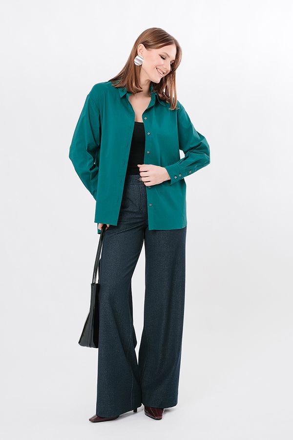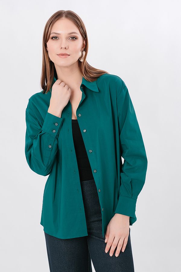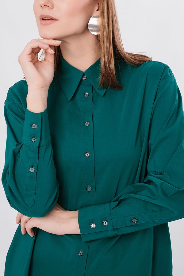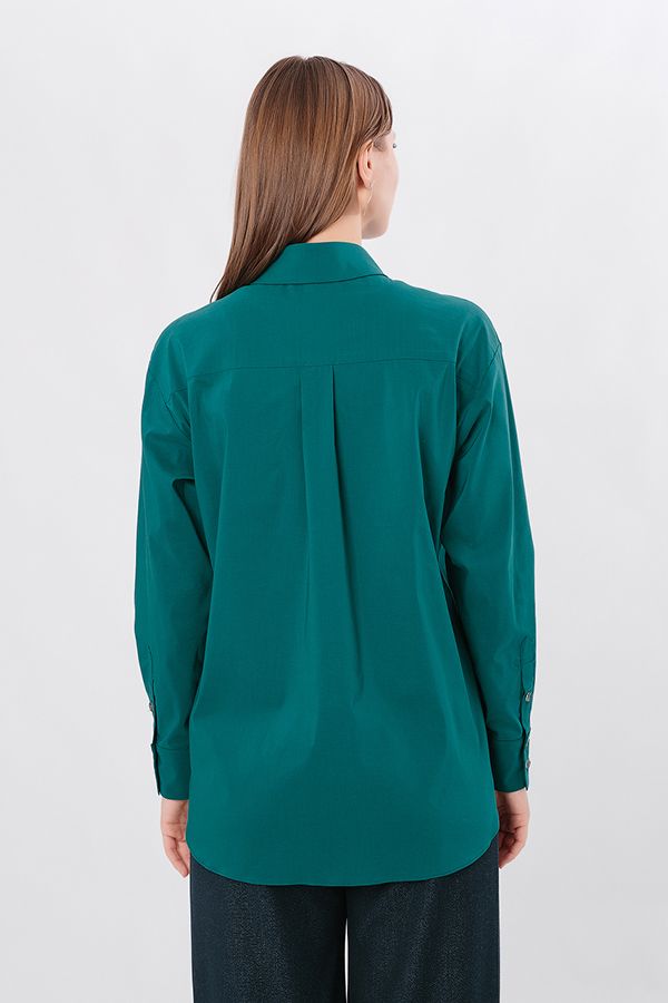 Классическая рубашка свободного силуэта из облегченной костюмной ткани. Застежка на пуговицы, по спинке кокетка. Длина по спинке 75 см. *Числовые параметры соответствуют размеру 44. Размер модели на фото: 44. Параметры модели: 90-64-97. Рост модели на фото: 175 см.