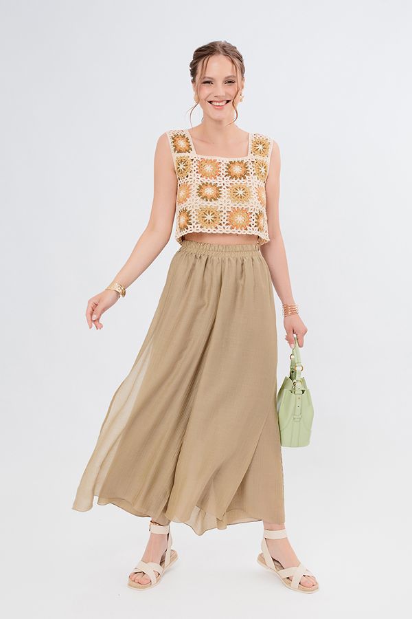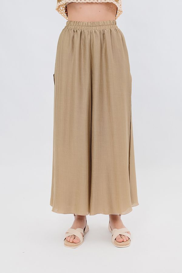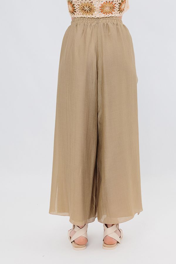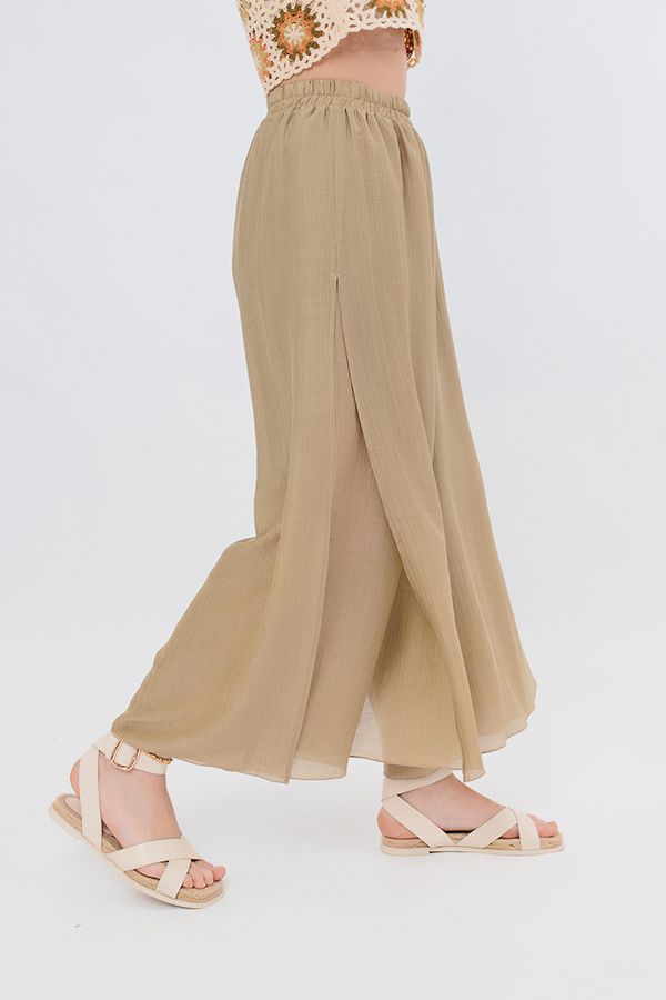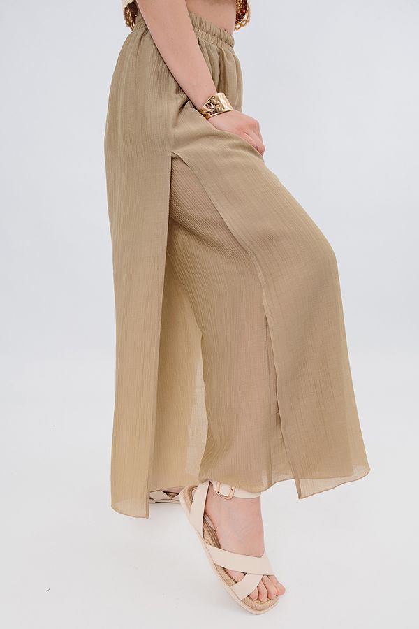 Воздушные двойные  брюки из легкой ткани с большим содержанием тенсела. Детали: в поясе резина,  верхний слой брюк с разрезом 28 см. в боковом шве (от пояса).  Длина по внутреннему шву - 67,5 см. Ширина по линии низа: 42 см. *Числовые параметры соответствуют размеру 44-46. Размер модели на фото: 44-46. Параметры модели: 94-65-100. Рост модели на фото: 175 см. Внимание! Размеры сдвоенные: 44-46, 48-50, 52-54.