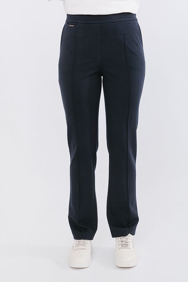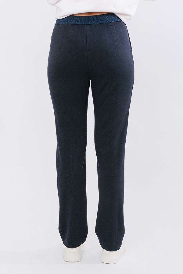 Модель брюк из трикотажного полотна. Детали: спереди имитация гульфика, карманы с отрезным бочком, по правой половинке брюк кармашек "для мелочи", по передней половинке застроченные стрелки, сзади вытачки. По задней половинке брюк, открытый пояс из цветной резины. Модель брюк подходит женщинам всех возрастов. Длина по внутреннему шву- 81 см. Ширина низа - 19 см. *Числовые параметры соответствуют размеру 46. Размер модели на фото: 44. Параметры модели: 86-63-94. Рост модели на фото: 173 м.