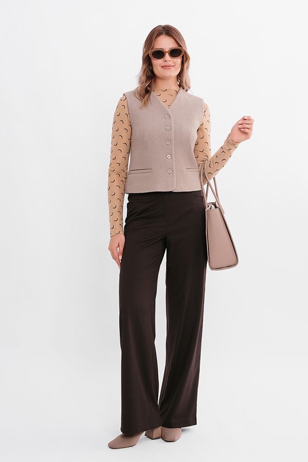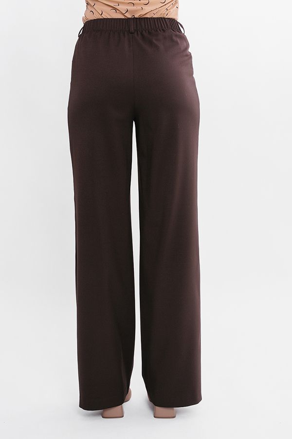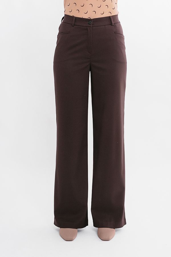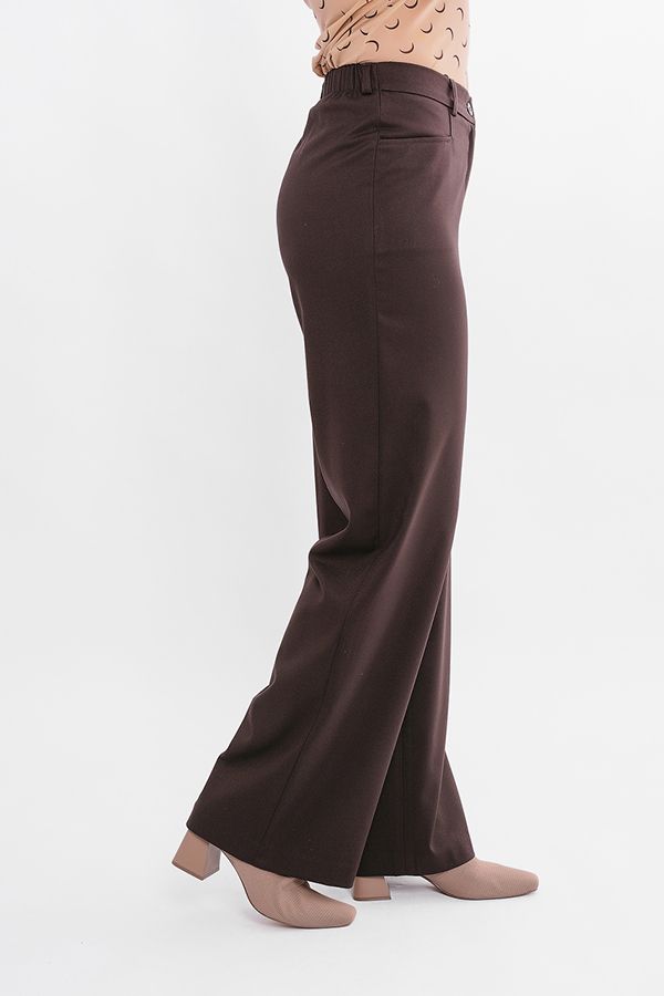 Элегантные  брюки насыщенного коричневого цвета в полной длине. Детали: спереди застежка на молнию и пуговицу, оригинальные карманы с горизонтальным входом,  по спинке в поясе резина на сборке , на поясе шлевки. Длина по внутреннему шву - 82 см. Ширина по линии низа: 27 см. *Числовые параметры соответствуют размеру 44. Размер модели на фото: 44. Параметры модели: 86-63-94. Рост модели на фото: 173 см.