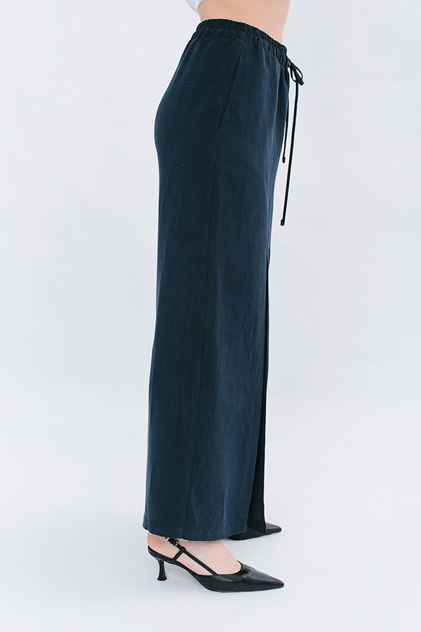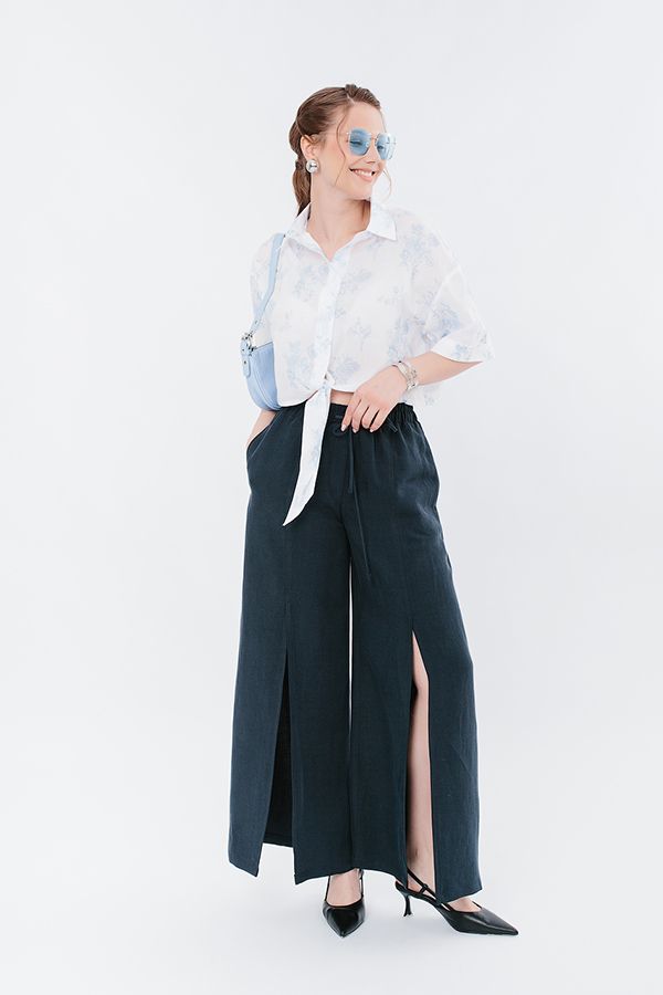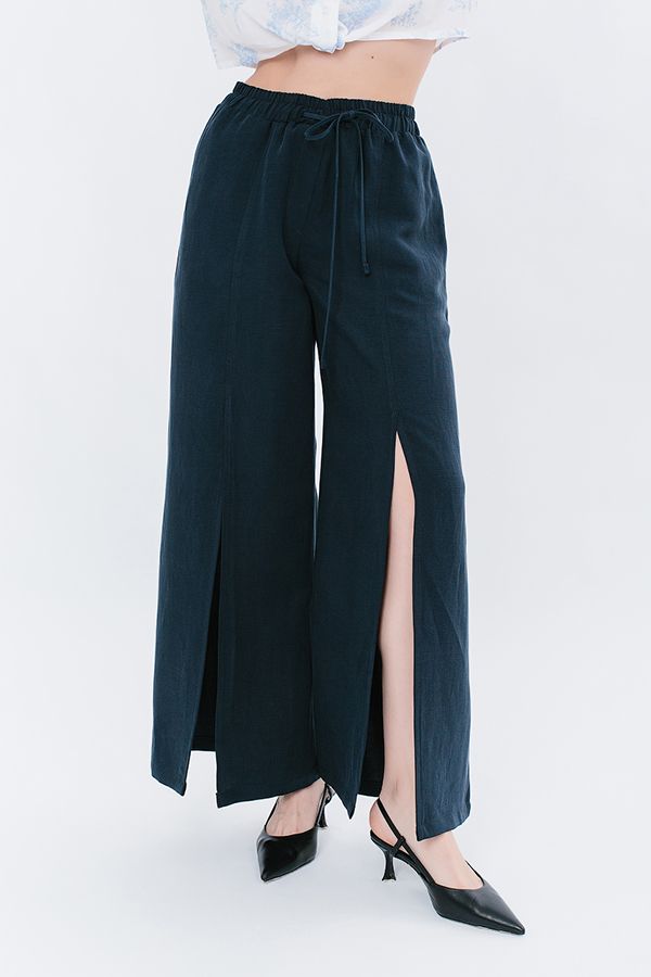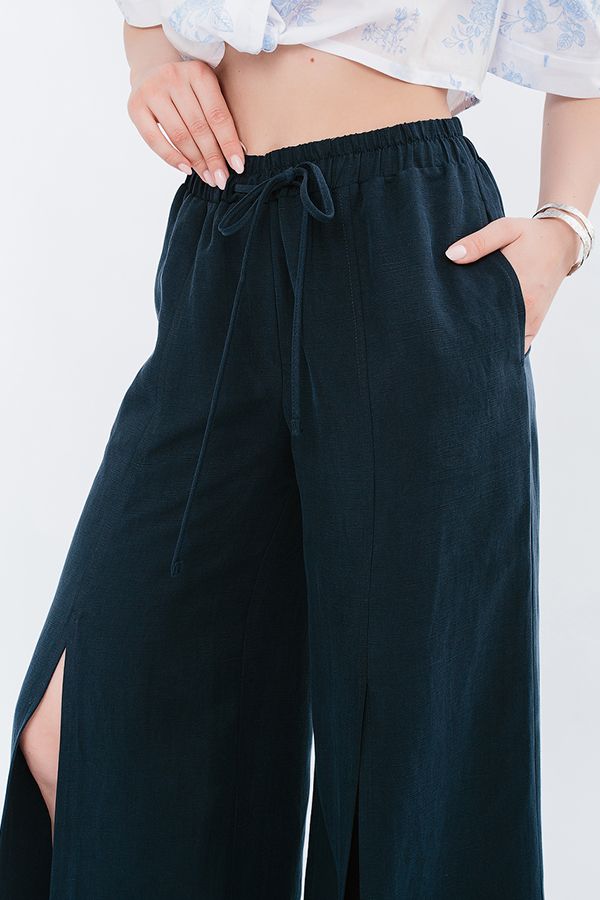 Экстравагантные широкие летние брюки с разрезом. Детали: спереди имитация гльфика, по передней половинке брюк рез с отстрочкой и разрезом 53 см (от пояса), карманы с вертикальным входом в боковом шве. В поясе резина на сборке, кулиска. Длина по внутреннему шву - 73,5 см. Ширина по линии низа: 47,5 см. *Числовые параметры соответствуют размеру 44. Размер модели на фото: 46. Параметры модели: 94-65-100. Рост модели на фото: 175 см.