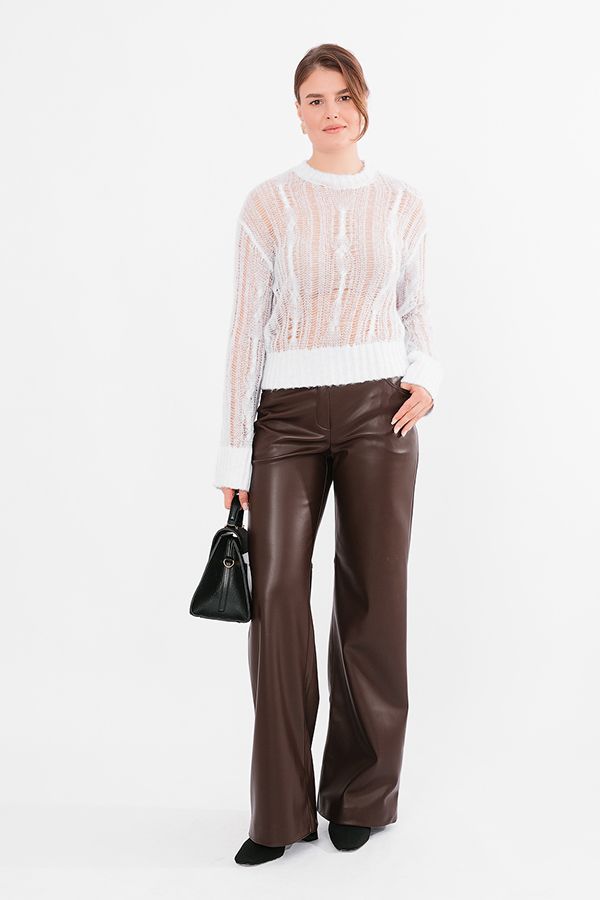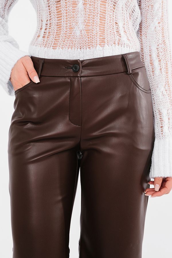 Модный силуэт-клеш от середины бедра. Детали: спереди застежка на молнию и пуговицу, карманы с горизонтальным входом. Фигурный пояс со шлевками, по спинке пояса резина на сборке. По задней половине брюк горизонтальные резы выше уровня колена. Длина по внутреннему шву-85 см. Ширина низа- 29 см. "числовые параметры соответствуют размеру 42. размер модели на фото 44. Параметры модели: 86-63-94. Рост модели на фото: 173 см.