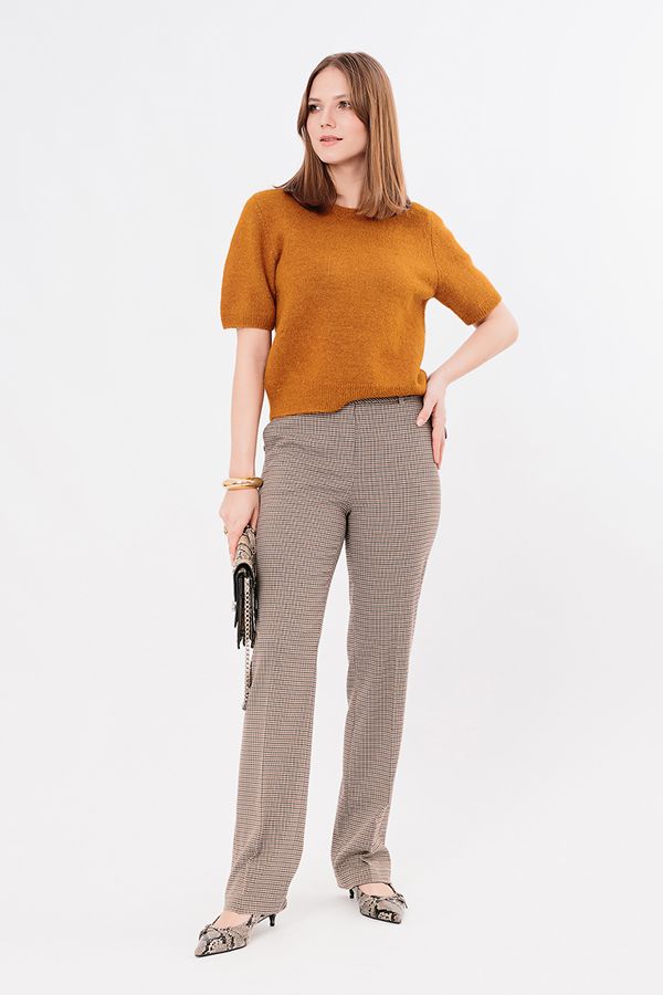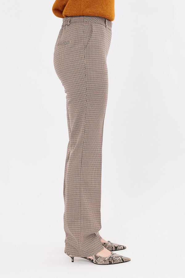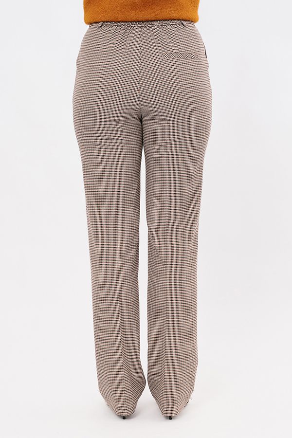 Элегантная модель брюк со стрелками, на фигурном поясе с цельнокроенным хлястиком и незначительным клешем от колена. Детали: спереди застежка на молнию и пуговицу, боковые карманы. Сзади по правой стороне листочка с имитацией кармана. На поясе шлевки, по спинке вставленна резина на сборке. Длина по внутреннему шву - 84 см. Ширина низа - 22 см. Числовые параметры соответствуют размеру 44. Размер модели на фото: 46. Параметры модели: 90-64-97. Рост модели на фото: 175 см.