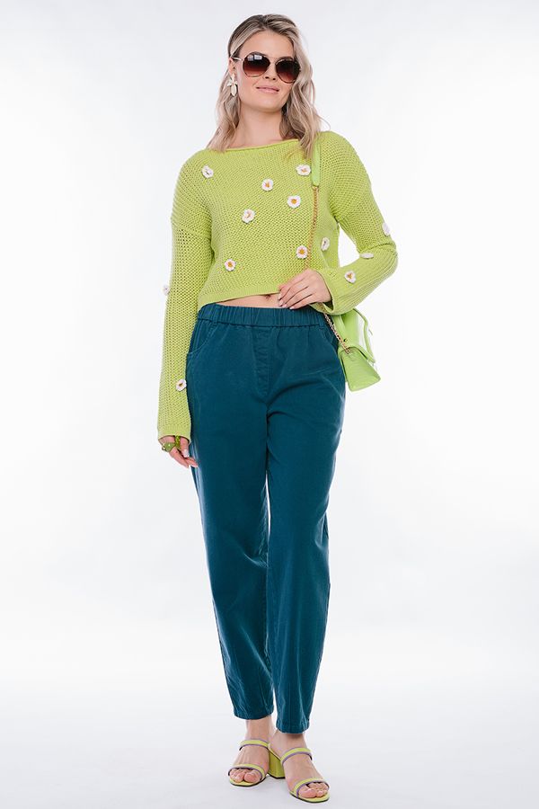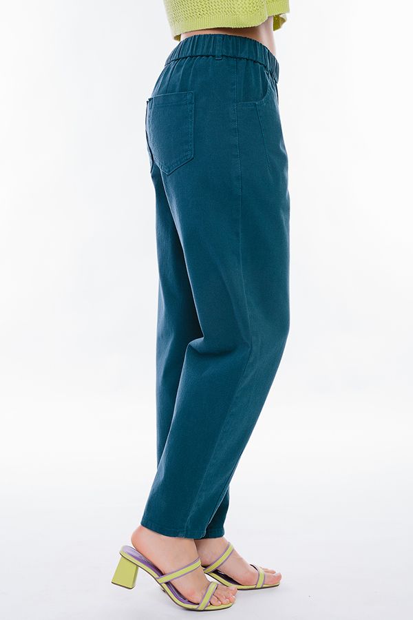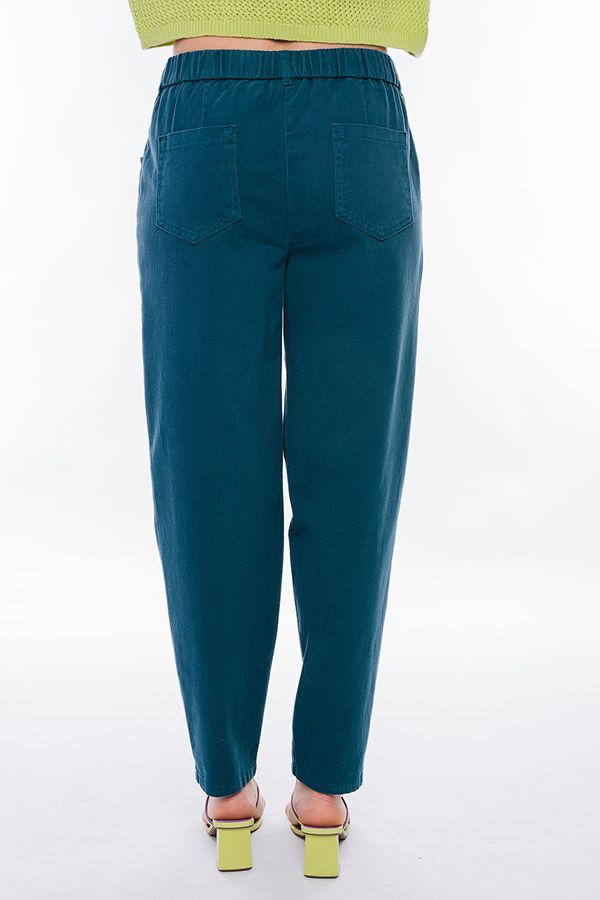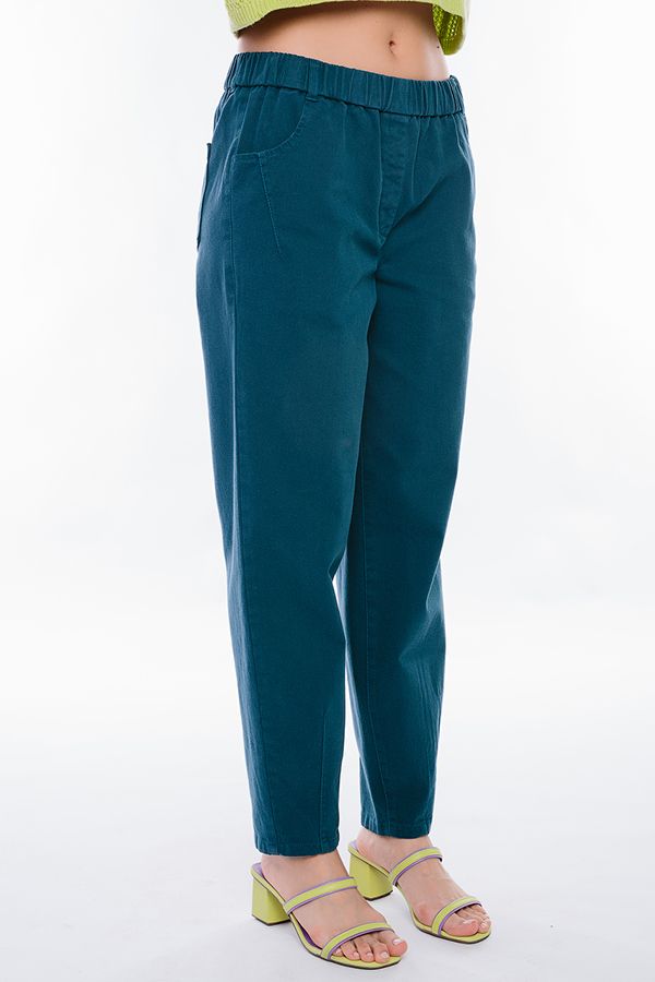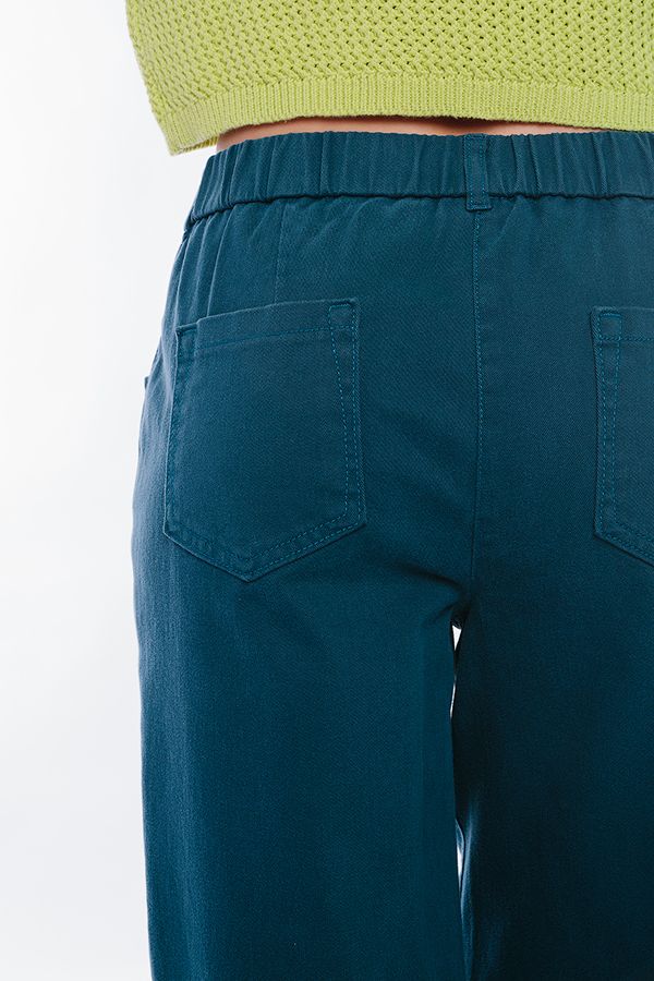 Молодежные джинсы-бананы глубокого цвета аквамарин. Детали: спереди имитация гульфика, боковые карманы с горизонтальным входом, сзади под вытачками накладные карманы. На поясе шлевки. В поясе резина. По передней половинке , по линии низа брюк- две вертикальные вытачки. Длина по внутреннему шву - 66 см. Ширина низа - 15 см. *Числовые параметры соответствуют размеру 44. Размер модели на фото: 42. Параметры модели: 86-53-94. Рост модели на фото: 173 см.