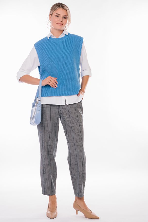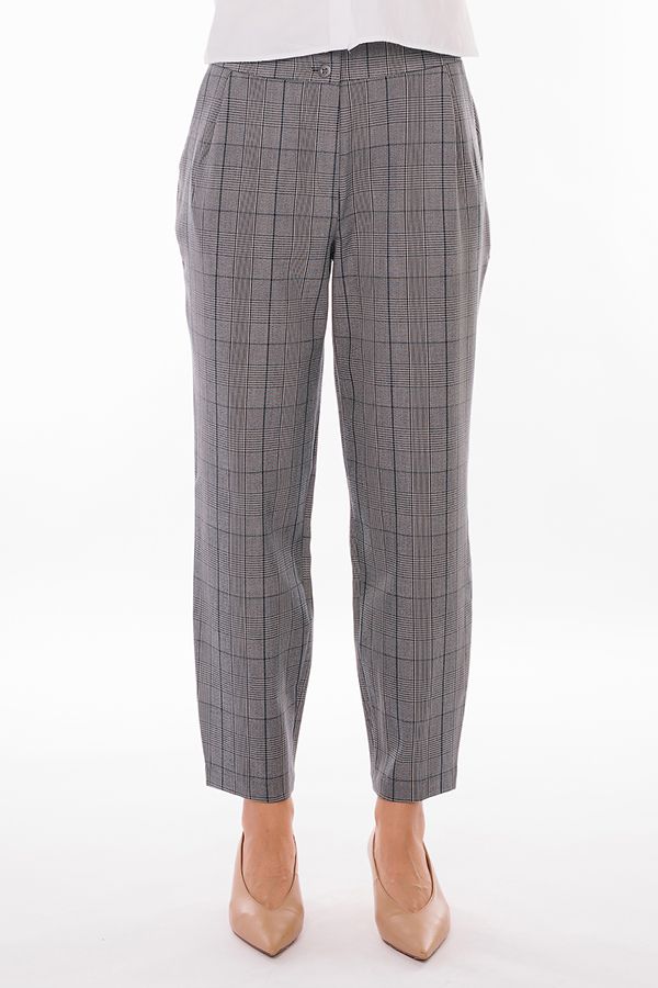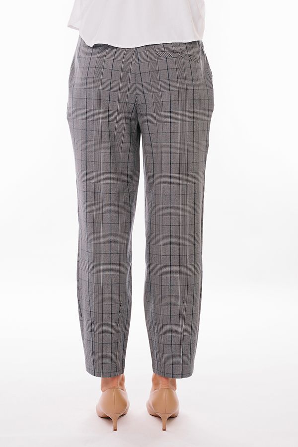 Брюки в городском стиле, силуэт - "бананы". Детали: застежка на молнию и две пуговицы, по линии пояса по бокам защипы, полноценные боковые карманы с отрезным бочком. Сзади , по правой стороне имитация кармана в рамке. По линии низа оригинальная отделка. По задней половинке пояса резина.