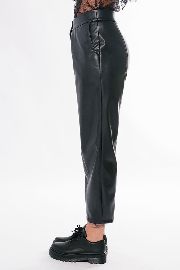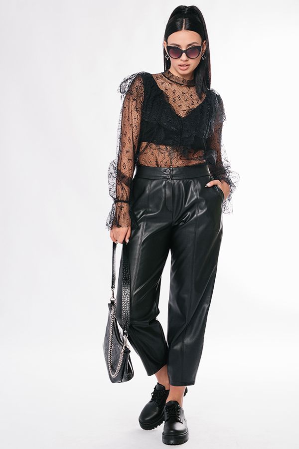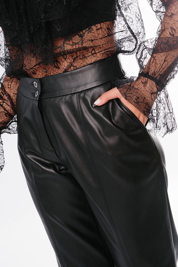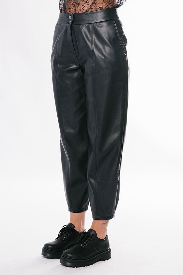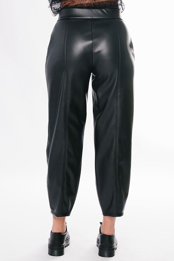 Молодежные брюки О-силуэта из черной эко-кожи. Детали: отстроченные вертикальные рельефы по передней и задней половинкам брюк, застежка на молнию и две пуговицы, боковые карманы с отрезным бочком. Длина по внутреннему шву: 67 см. Ширина низа: 16 см. Числовые параметры соответствуют размеру: 46. Размер модели на фото: 46. Параметры модели: 86-64-100. Рост модели на фото: 174 см.
