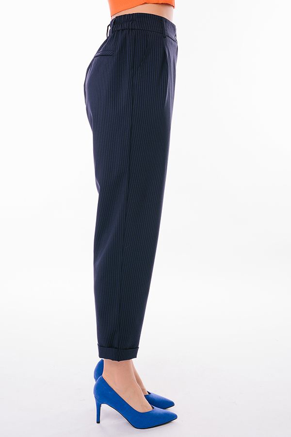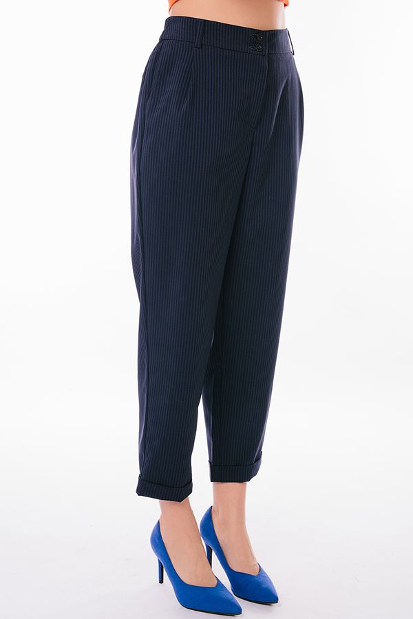 Брюки из легкой тонкой летней ткани свободного силуэта. Детали: застежка на молнию и две пуговицы, по линии пояса по бокам зашитые защипы, полноценные боковые карманы с отрезным бочком. Сзади вытачки, по правой половинке брюк, имитация кармана в рамке. По задней половинке пояса резина на сборке, шлевки. По линии низа отворот, который можно использовать для изменения длины брюк. Длина по внутреннему шву - 67,5 см. Ширина по линии низа - 18 см. *Числовые параметры соответствуют размеру 44. Размер модели на фото: 44. Параметры модели: 86-53-94. Рост модели на фото: 173 см.