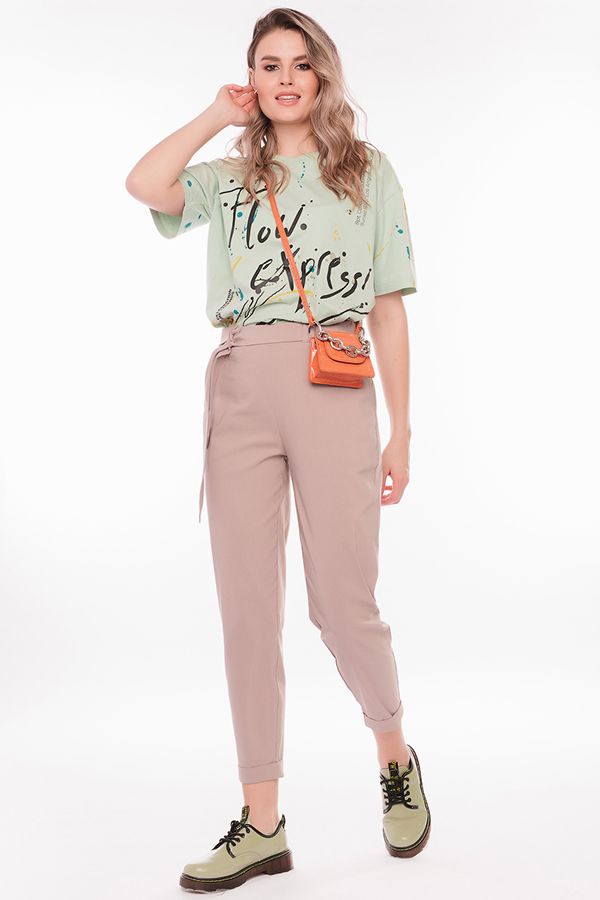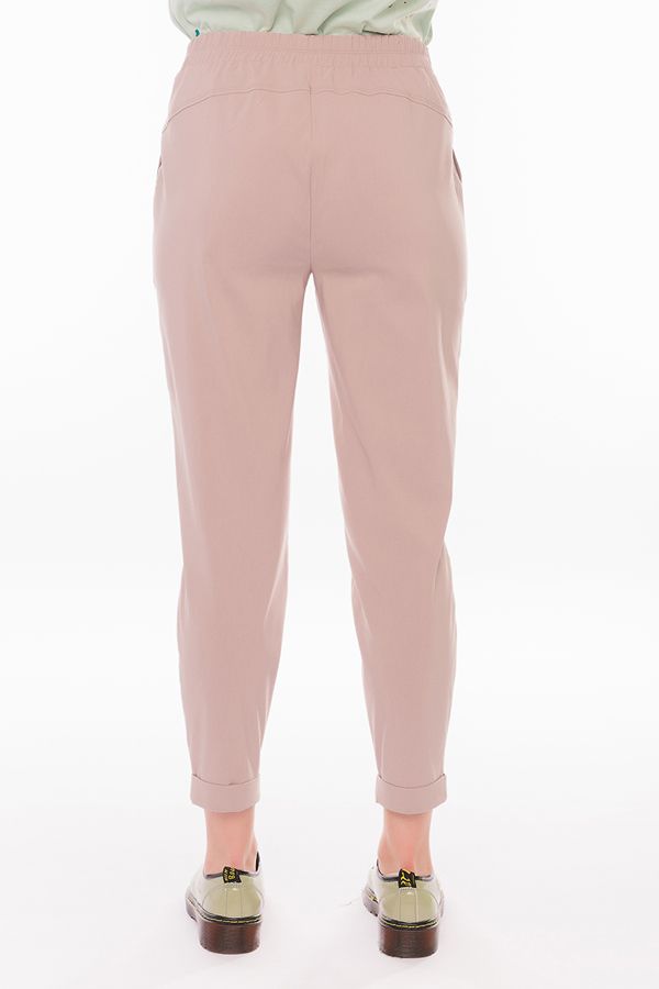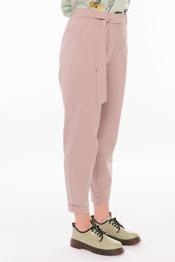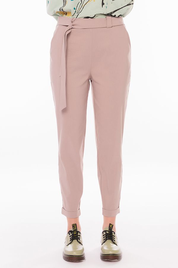 Модель брюк в молодежном стиле. Силуэт: бананы. Детали: спереди боковые карманы, на поясе шлевки, сзади в поясе резина, фигурная кокетка. По передней половинке брюк, в боковые швы вшит тканевый пояс. По линии низа отворот, с помощью которого можно регулировать длину брюк. Длина по внутреннему шву - 67 см. Ширина низа - 14 см. *Числовые параметры соответствуют размеру: 44. Размер модели на фото: 42. Параметры модели: 86-63-94 Рост модели на фото: 173 см.
