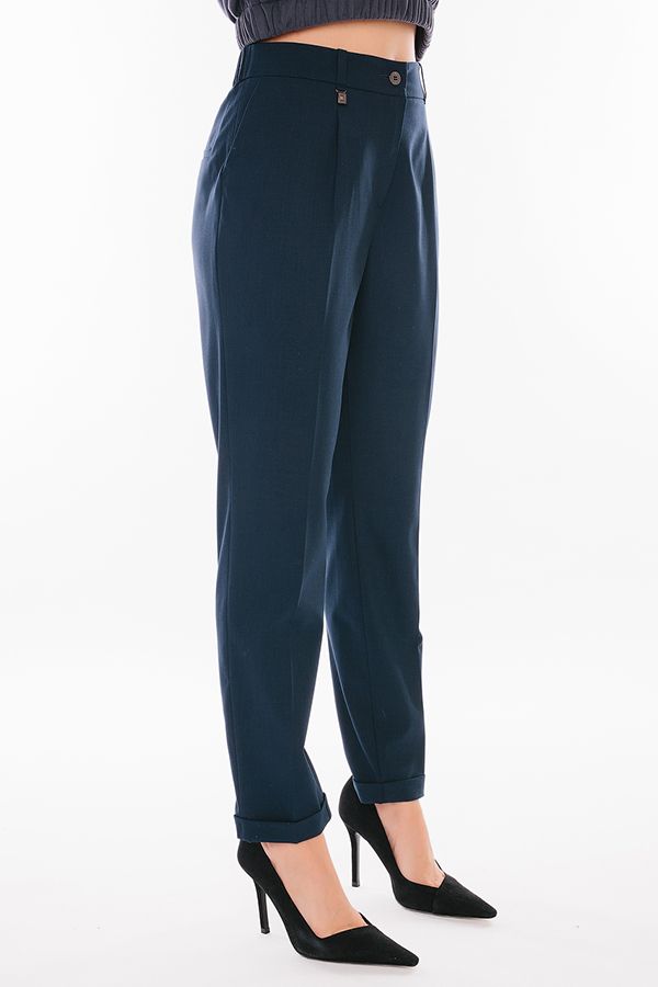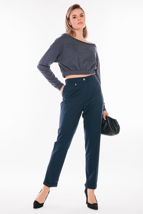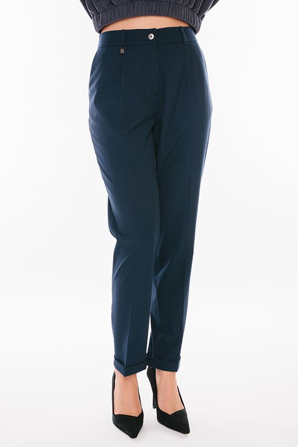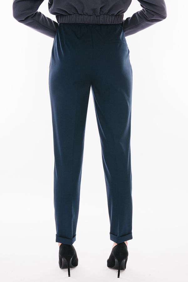 Модель в городском стиле со стрелкой из легкой ткани. Идеальное решение для офиса в не жаркий летний день. Детали: по передней половинке защипы, шлевки на фигурном поясе, застежка на молнию и пуговицу, боковые карманы с отрезным бочком, украшение с логотипом. Сзади под вытачками листочка с имитацией кармана. По задней половинке брюк, в поясе резина на сборке. Длина брюк регулируется отворотом по линии низа. Длина по внутреннему шву - 73 см. Ширина по линии низа - 16,5 см. *Числовые параметры соответствуют размеру 44. Размер модели на фото: 44. Параметры модели: 86-63-94. Рост модели на фото: 173 см.