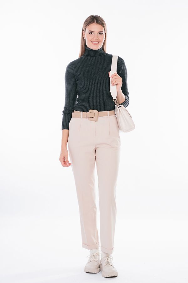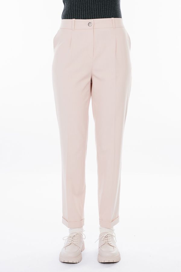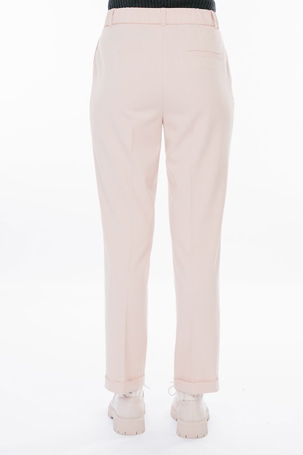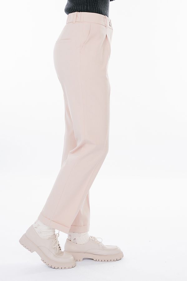 Модель в городском стиле со стрелкой из легкой ткани. Идеальное решение для офиса в  не жаркий летний день.  Детали: по передней половинке защипы, шлевки на фигурном поясе, застежка на молнию и пуговицу, боковые карманы с отрезным бочком. Сзади под вытачками листочка с имитацией кармана. По задней половинке брюк, в поясе резина на сборке.  Длина брюк регулируется отворотом по линии низа.  Длина по внутреннему шву - 73 см. Ширина по линии низа - 18 см. Числовые параметры соответствуют размеру 42. Размер модели на фото: 44. Параметры модели: 86-63-94. Рост модели на фото: 173 см.