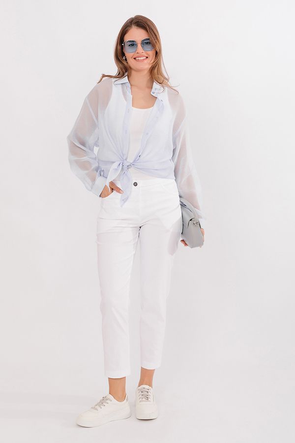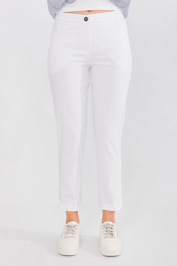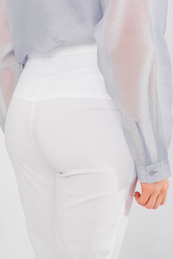 Современная модель брюк в стиле "Casual". Детали: спереди застежка на молнию и пуговицу, боковые карманы с горизонтальным входом. Сзади под кокеткой листочки с имитацией карманов. В поясе резина. По низу брюк функциональный отворот. Длина по внутреннему шву - 69 см. Ширина низа - 14 см. *Числовые параметры соответствуют размеру 44.  Размер модели на фото: 44. Параметры модели: 86-63-94. Рост модели на фото: 173 см.