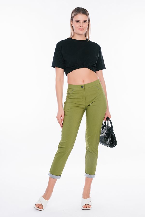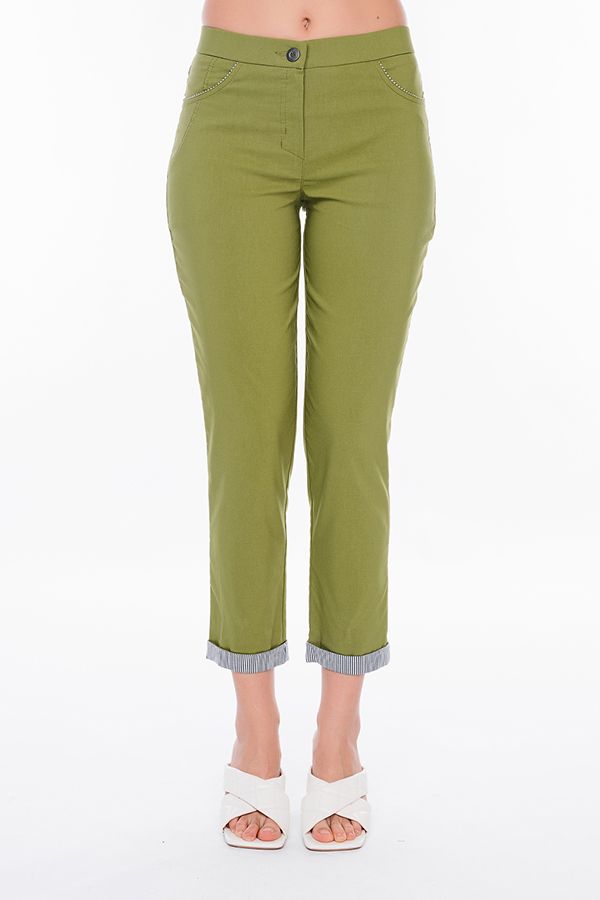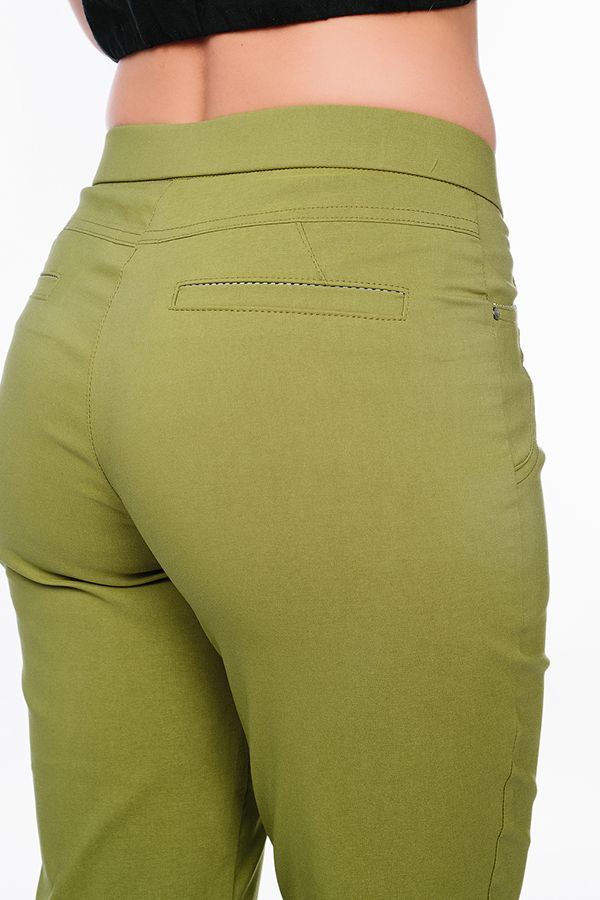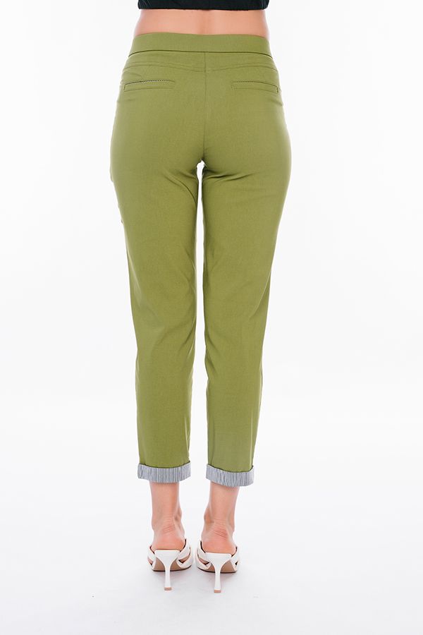 Современная модель брюк в стиле "Casual". Детали: спереди застежка на молнию и пуговицу, боковые карманы с горизонтальным входом и контрастной отделкой. Сзади под кокеткой листочки с имитацией карманов. В поясе резина. По низу брюк функциональный отворот с контрасной отделкой. Длина по внутреннему шву - 69 см. Ширина низа - 14 см. *Числовые параметры соответствуют размеру 44.  Размер модели на фото: 44. Параметры модели: 86-63-94. Рост модели на фото: 173 см.