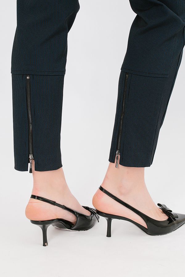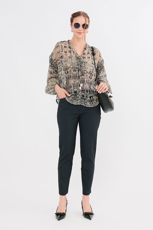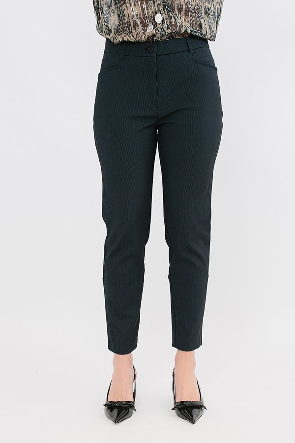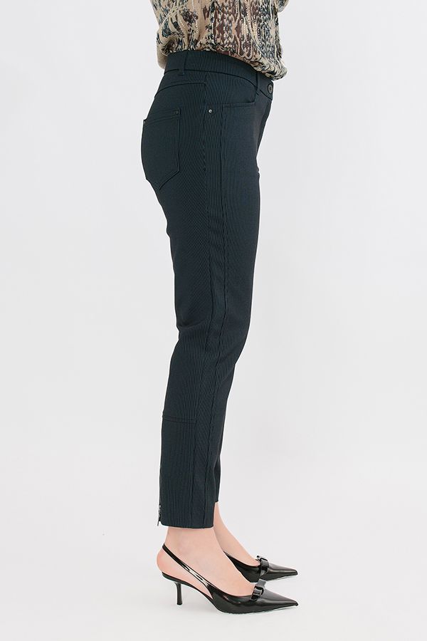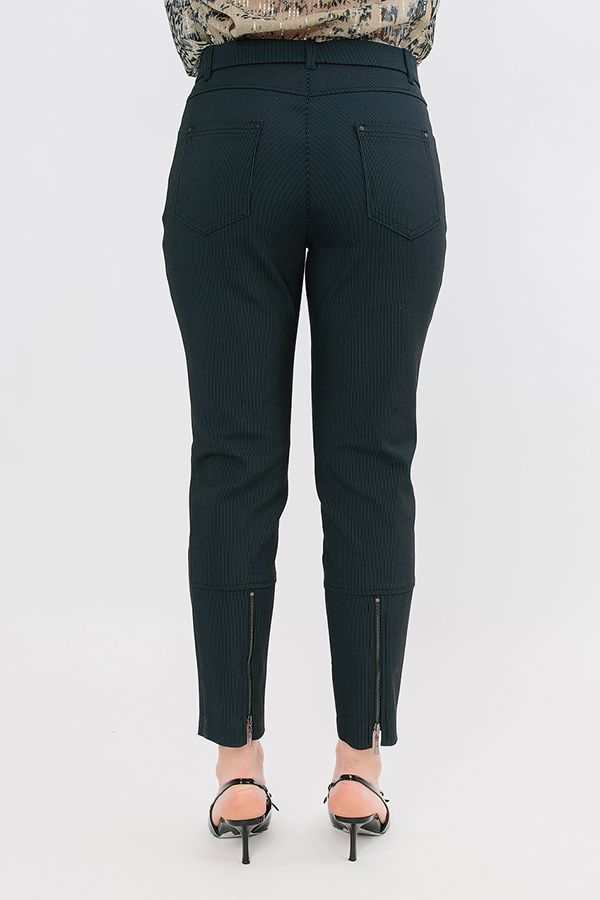Модель в городском стиле. Детали: спереди застежка на молнию и фирменную пуговицу, боковые карманы, вертикальный рельеф, сзади под кокеткой накладные карманы, по задней половинке брюк ,от середины икры, втачной функциональный замок. Карманы декорированы хольнитенами.