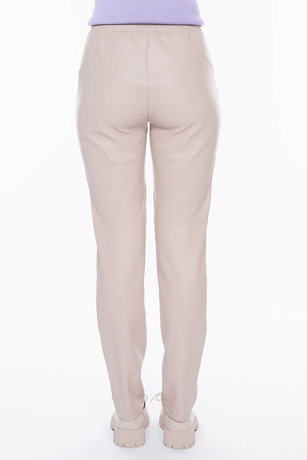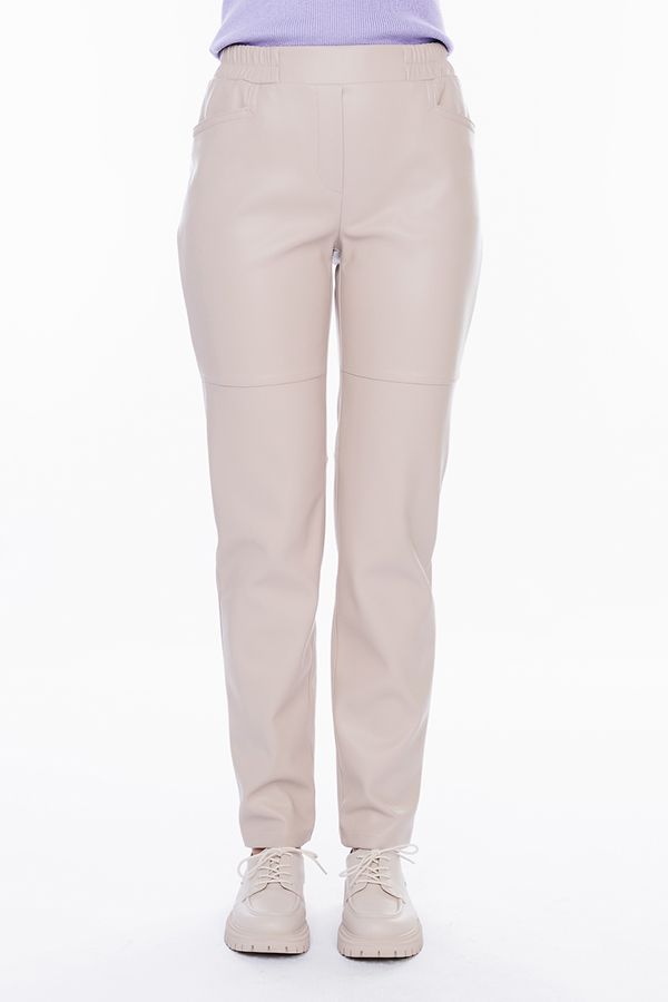 Стильные брюки из эко-кожи  в молодежном стиле. Силуэт прямой от колена, книзу заужен на 1,5 см, с имитацией гульфика, карманы с отрезным бочком прямоугольной формы. Пояс на резине. Сзади кокетка. По задней половине брюк горизонтальные резы ниже уровня колена, по передней половине- выше уровня колена. Отделка: двойными строчками, закрепки.
