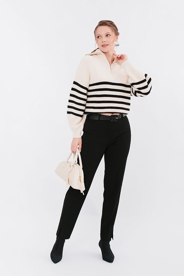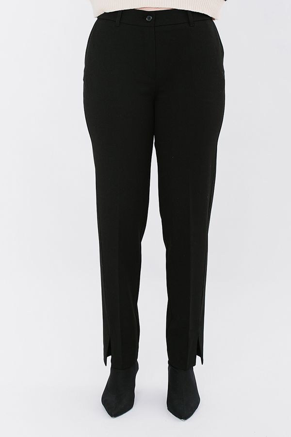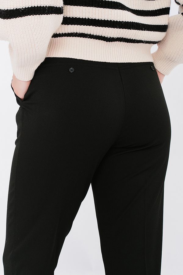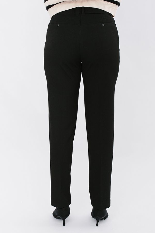 Модель брюк из черной костюмной ткани в городском стиле. Спереди застежка на молнию и пуговицу, боковые карманы, сзади кокетка с оригинальным решением имитации карманов. Смещенный боковой шов с отстрочкой , заканчивается разрезом 9 см. Длина по внутреннему шву - 75 см. Ширина низа - 17,5 см. *Числовые параметры соответствуют размеру 46. Размер модели на фото: 46. Параметры модели: 94-65-100. Рост модели на фото: 175 см.