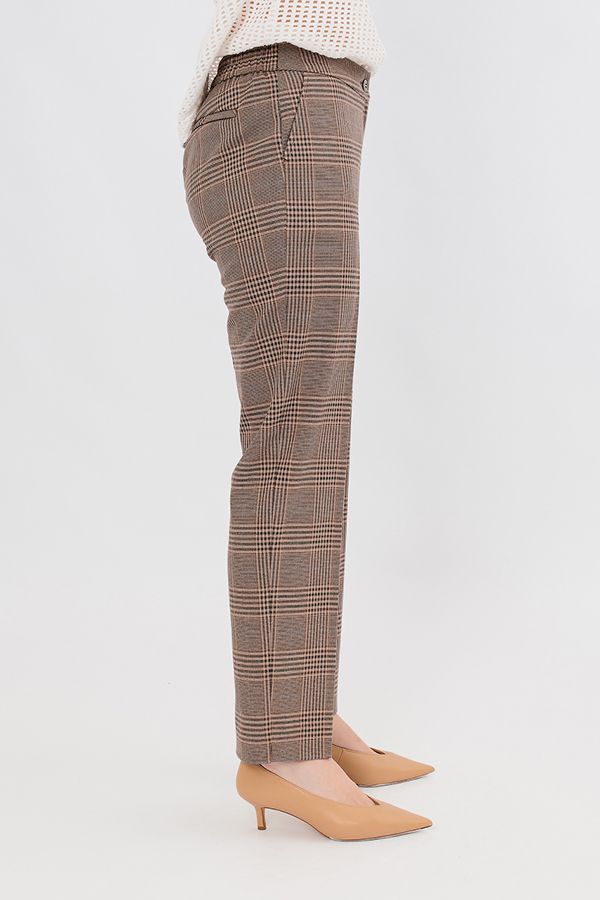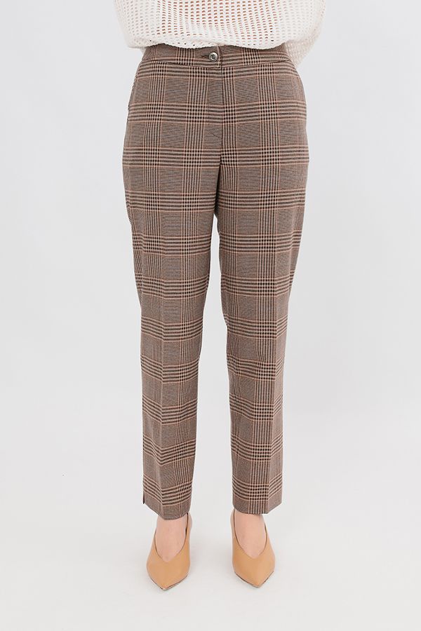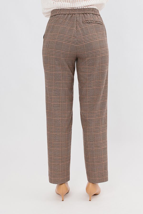 Модель брюк из костюмной ткани в городском стиле. Спереди застежка на молнию и пуговицу, боковые карманы, сзади по правой стороне листочка с имитацией кармана. По передней половинке фигурный пояс, по задней половинке в поясе эластичная лента на сборке. По низу изделия, в боковом шве разрез 3 см. Длина по внутреннему шву - 74 см. Ширина низа - 19 см. *Числовые параметры соответствуют размеру 44. Размер модели на фото: 46. Параметры модели: 94-65-100. Рост модели на фото: 175 см.