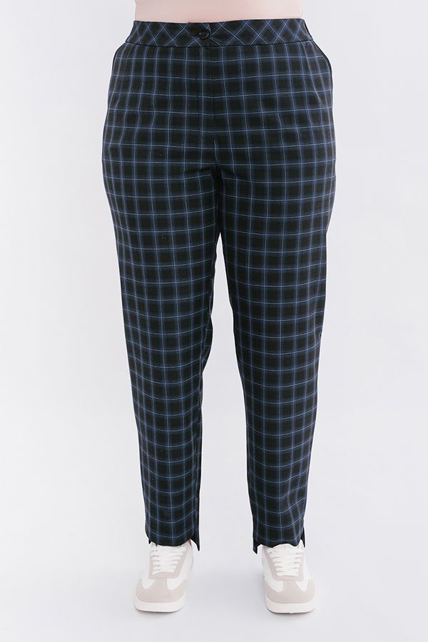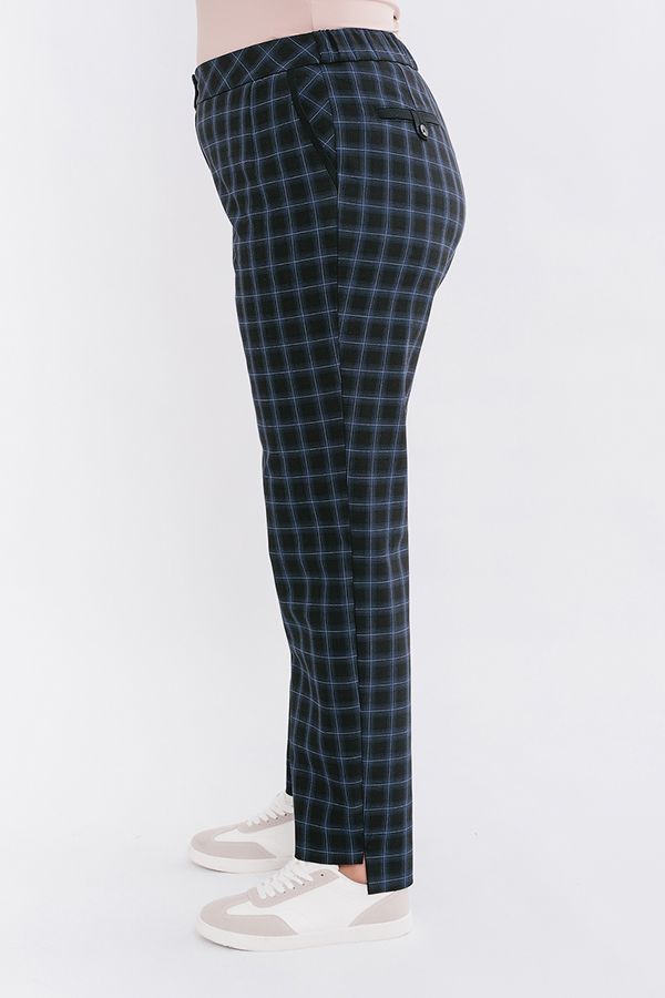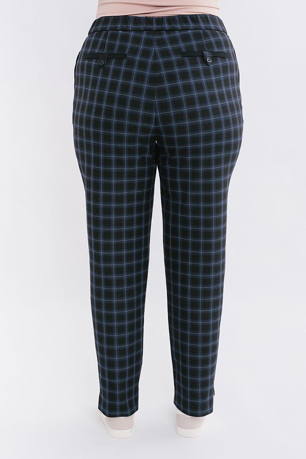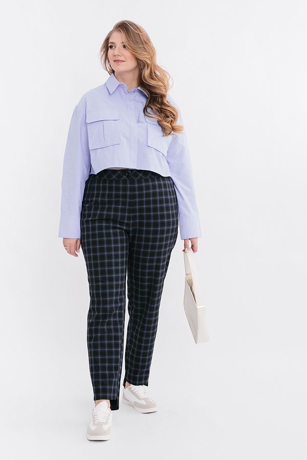 Модель брюк со стрелками в городском стиле. Спереди боковые карманы, сзади листочка контрастного цвета с имитацией кармана. По передней половинке фигурный пояс, по задней в поясе эластичная лента. Оригинальная отделка низа. Длина по внутреннему шву - 72 см. Ширина низа - 18 см. Размер модели на фото: 52. Параметры модели: 100-82-113. Рост модели на фото: 170 см.