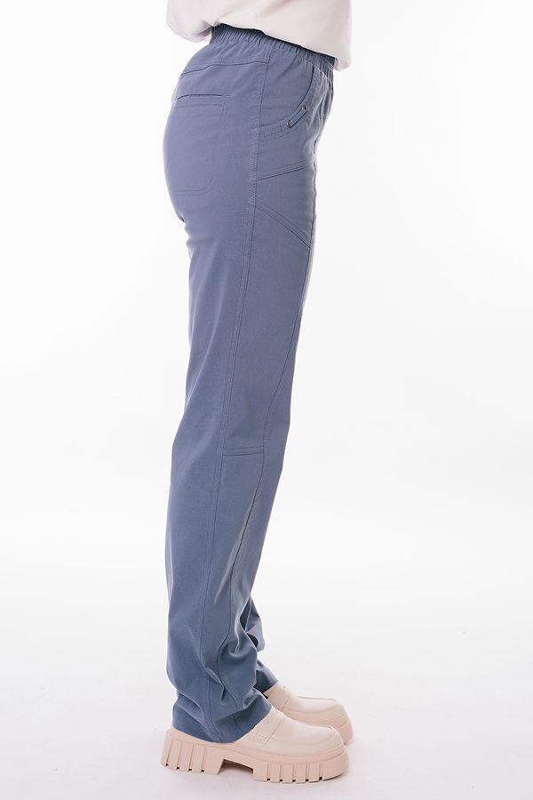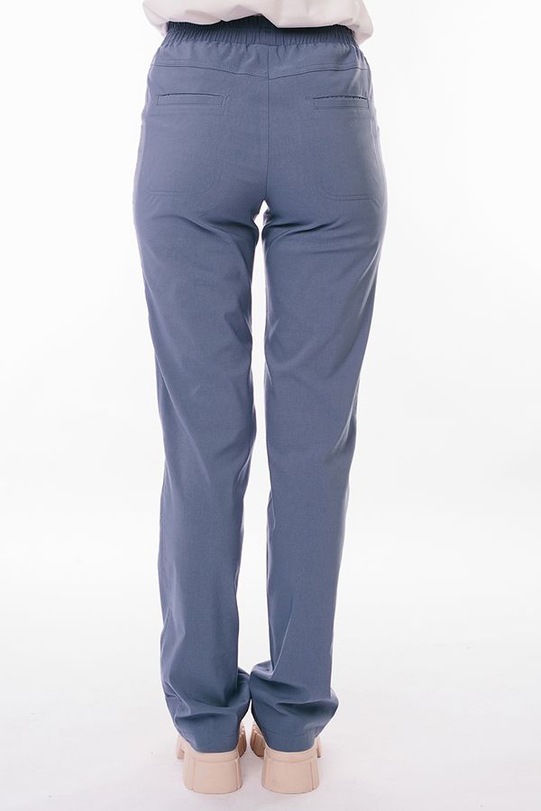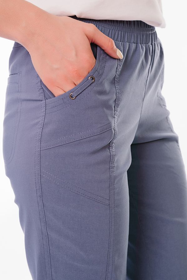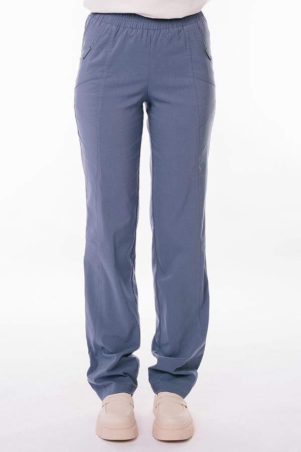 Модель брюк в спортивном стиле без застежки (пояс на резине). Детали: спереди вертикальный рельеф, боковые карманы с оригинальной отделкой люверсами, сзади, под кокеткой, внутренние карманы с листочкой. *Числовые параметры соответствуют размеру 52. Длина по внутреннему шву: 83 см. Ширина по линии низа: 20 см. Размер модели на фото: 44.  Параметры модели: 86-63-94. Рост модели на фото: 173 см.