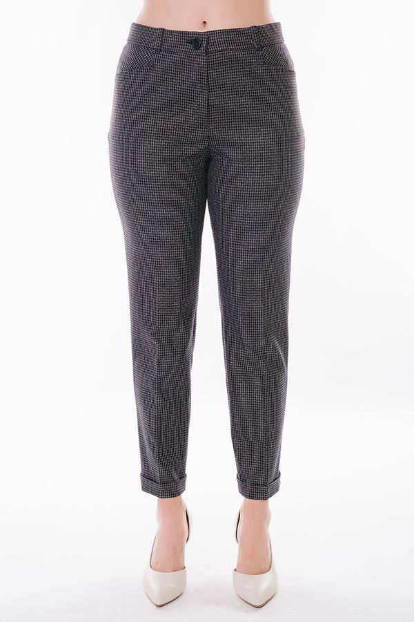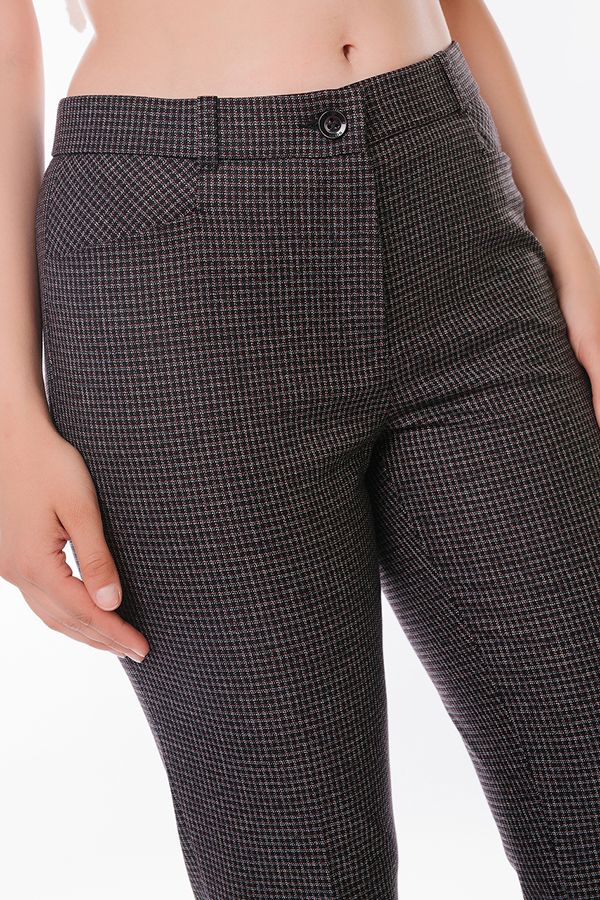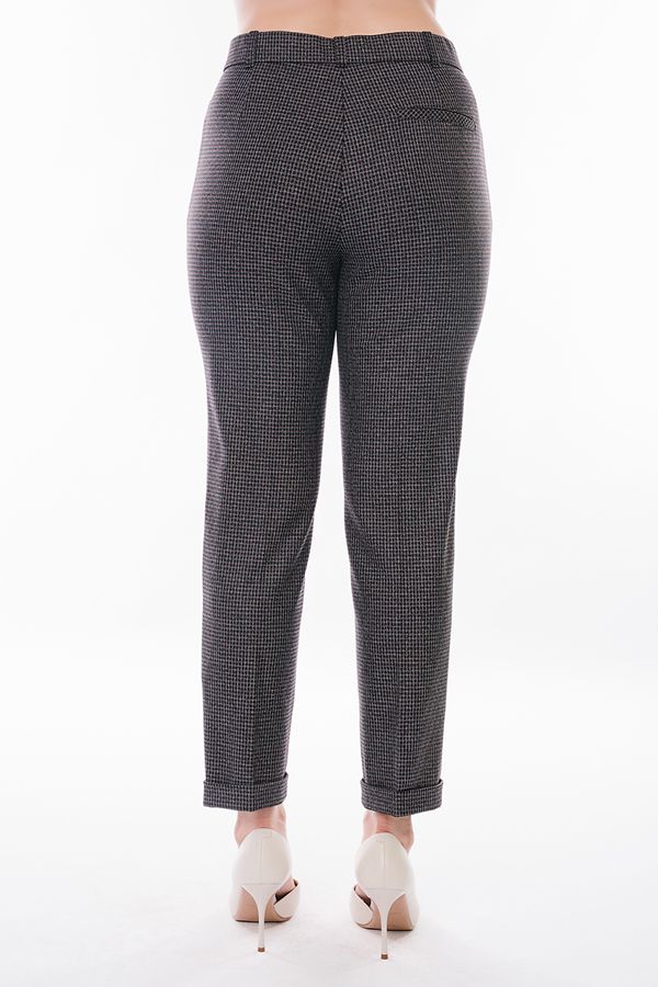 Модель в классическом стиле со стрелками. Детали: спереди застежка на молнию и пуговицу, боковые карманы с горизонтальным входом, сзади под вытачками справа листочка с имитацией кармана. В пояс вставлена эластичная лента. По линии низа отворот, который можно использовать для изменения длины брюк. Длина по внутреннему шву - 73,5 см. Ширина низа - 17,5 см. Числовые параметры соответствуют размеру 42. Размер модели на фото: 44. Параметры модели: 89-62-97. Рост модели на фото: 175 см.