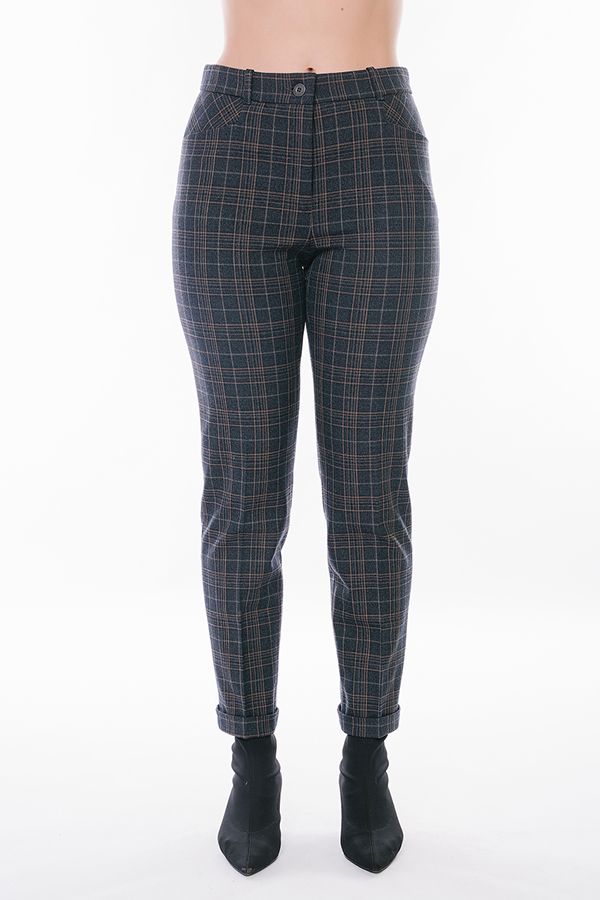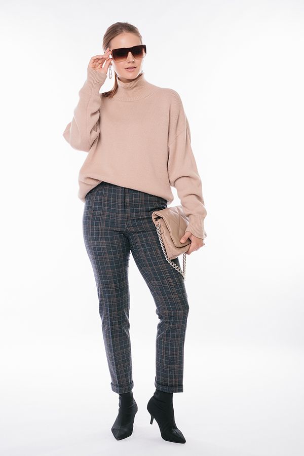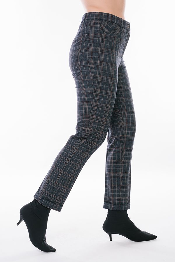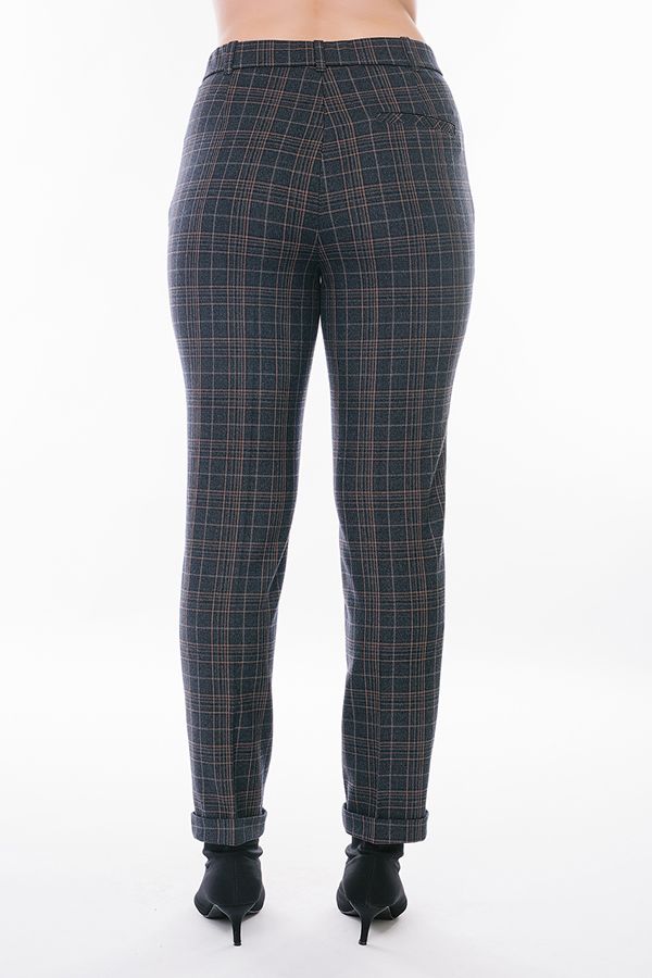 Модель в классическом стиле со стрелками. Детали: спереди застежка на молнию и пуговицу, боковые карманы с горизонтальным входом, сзади под вытачками справа листочка с имитацией кармана. В пояс вставлена эластичная лента. По линии низа отворот, который можно использовать для изменения длины брюк. Длина по внутреннему шву - 73 см. Ширина низа - 17,5 см. Числовые параметры соответствуют размеру 46. Размер модели на фото: 44. Параметры модели: 89-62-97. Рост модели на фото: 175 см.