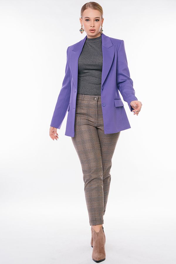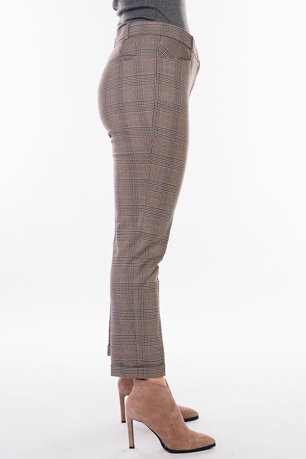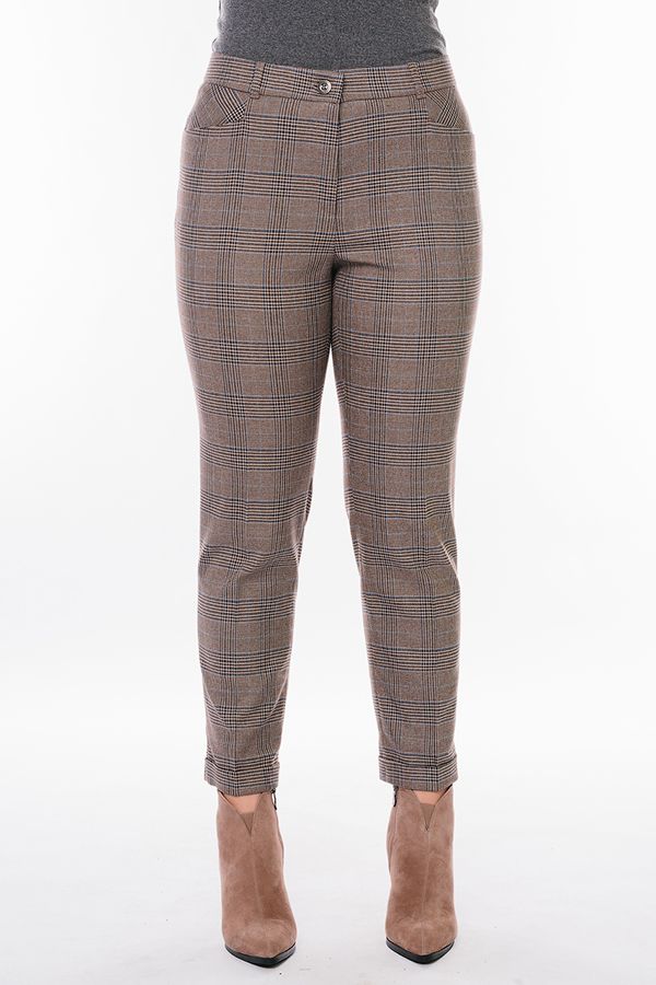 Модель в классическом стиле со стрелками. Детали: спереди застежка на молнию и пуговицу, боковые карманы с горизонтальным входом. Отделка сзади: вытачки, по правой половине листочка с имитацией кармана. В пояс вставлена эластичная лента. По линии низа отворот, который можно использовать для изменения длины брюк.