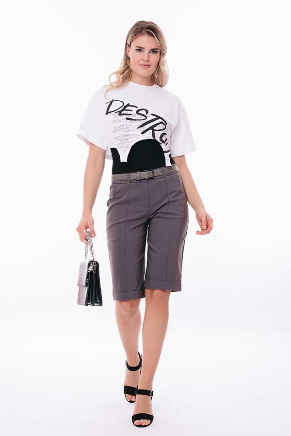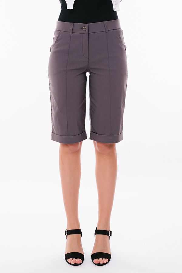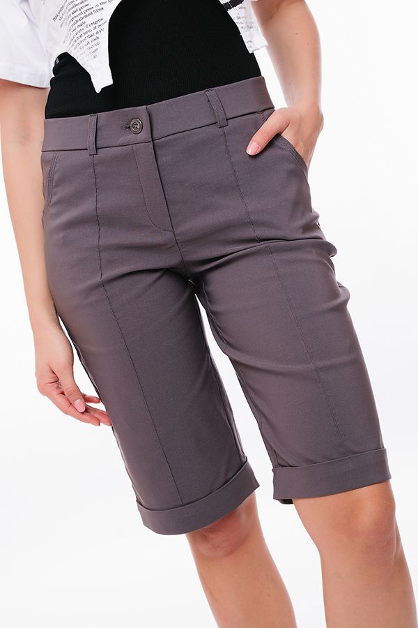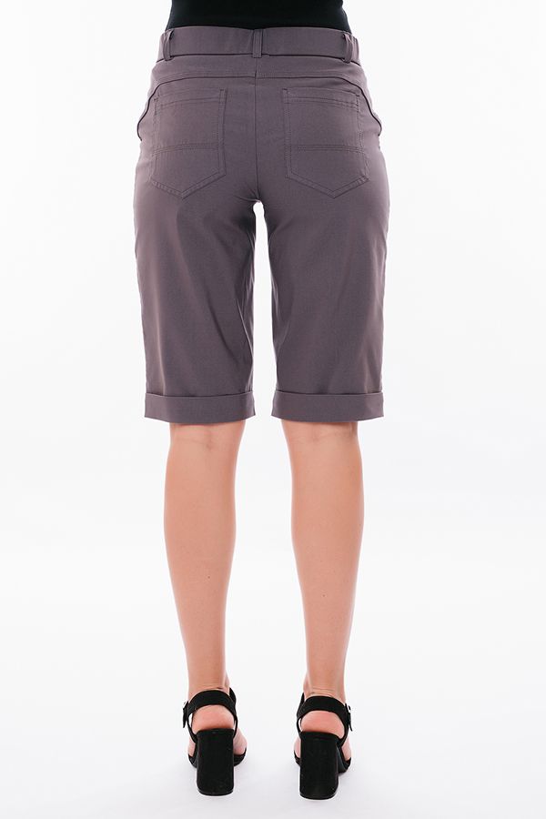 Бермуды с застроченной стрелкой в городском стиле. Детали: спереди застежка на молнию, боковые карманы, шлевки на поясе, по линии низа отворот, сзади под фигурной кокеткой накладные карманы. Отделка кокетки и карманов спереди - тройная строчка. Длина по внутреннему шву - 33 см. Ширина низа - 25,5 см. *Числовые параметры соответствуют размеру 48. Размер модели на фото: 44 Параметры модели: 86-63-94. Рост модели на фото: 173 см.