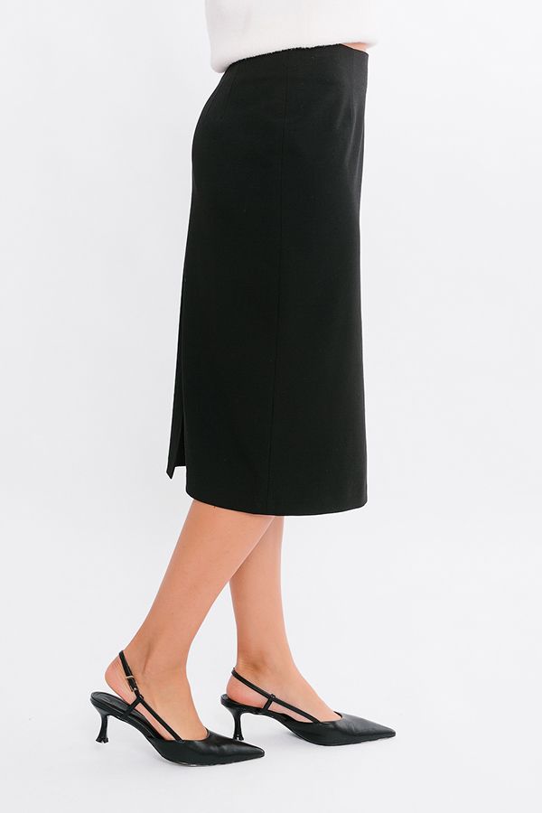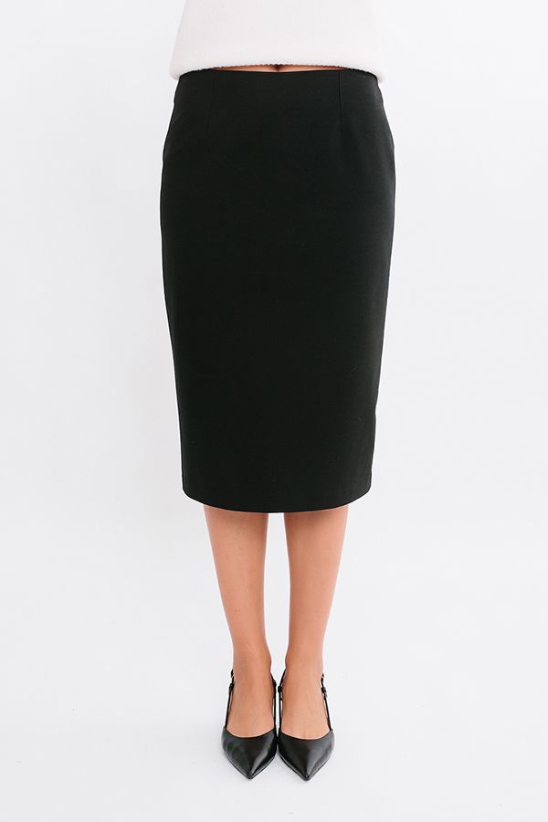 Классическая модель прямой юбки из черной костюмной ткани. Юбка на подкладке, без пояса, по переду изделия вытачки. По задней половинке по две вытачки, застежка на потайную молнию в среднем шве, щлица. Длина изделия 68 см. Размер модели на фото: 44. Параметры модели: 86-63-94. Рост модели на фото: 173 см.