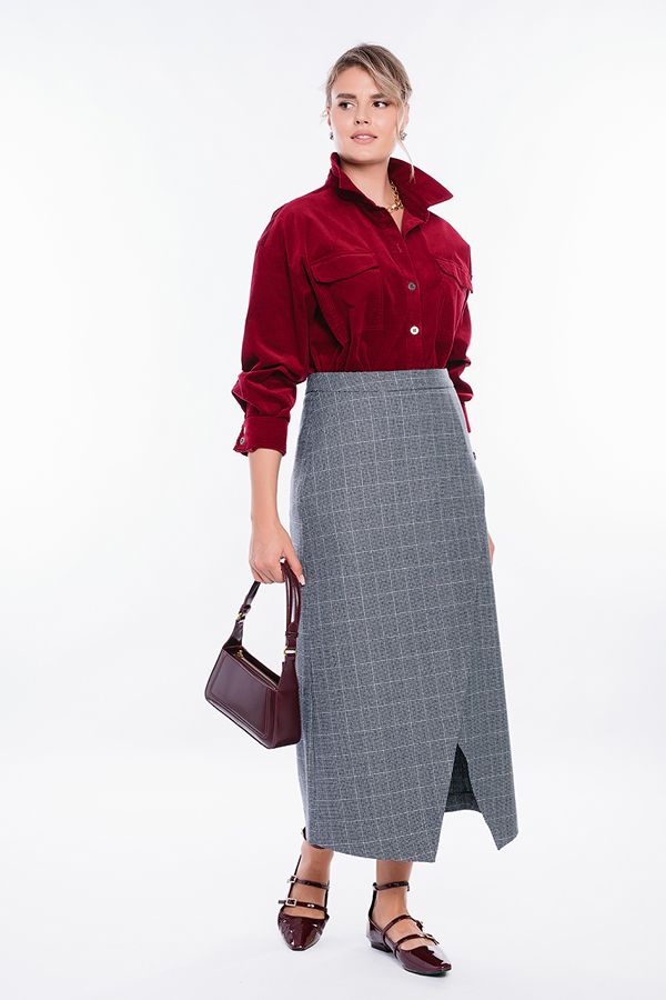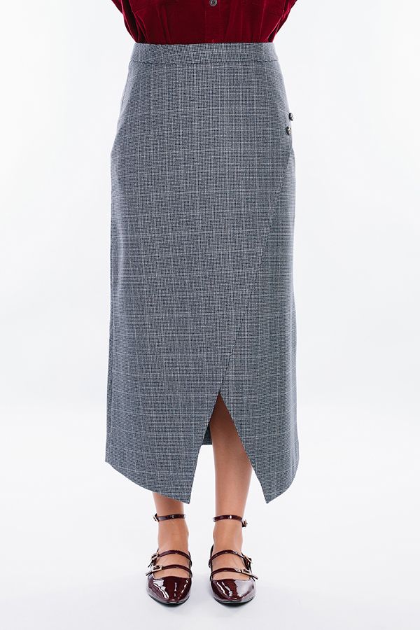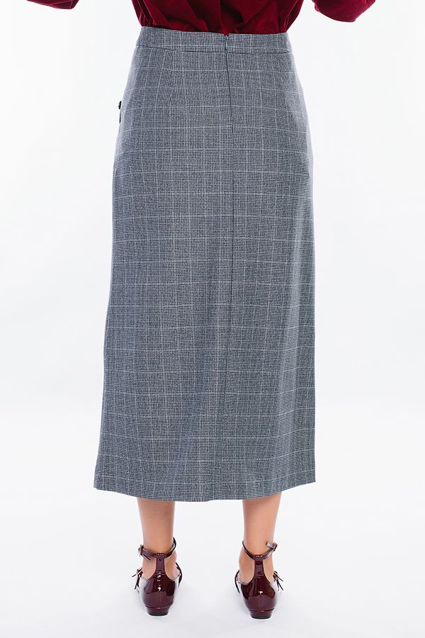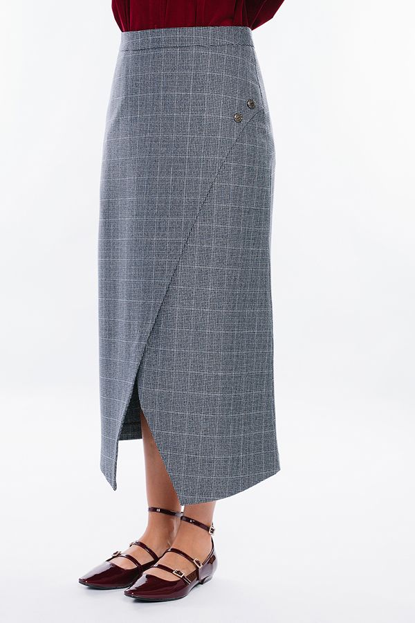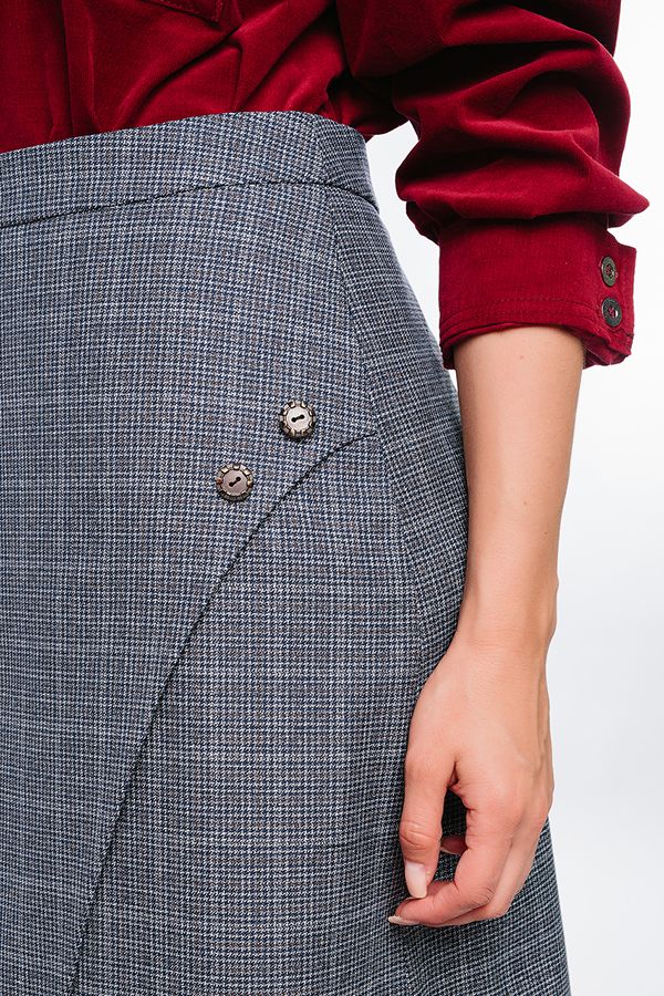 Современная юбка-миди из костюмной ткани на фигурном поясе. Детали: по передней половинке изделия, фигурный запах на левую сторону, с отделкой пуговицами. Сзади вытачки, в среднем шве потайная молния. Изделие на подкладке. Длина изделия 83 см. Размер модели на фото: 44. Параметры модели: 86-63-94. Рост модели на фото: 173 см.
