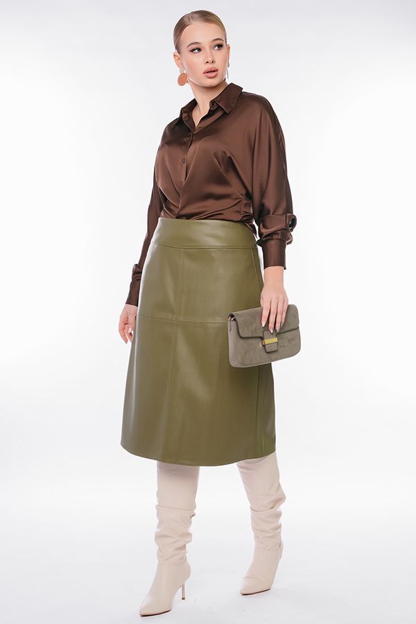 Юбка А-образного силуэта из эко-кожи с рельефными отстрочками. Юбка на широком поясе- кокетке, спереди карманы с отрезным бочком. Сзади в среднем шве металлическая молния. Длина изделия: 70 см. Размер модели на фото: 48. Параметры модели: 94-68-102. Рост модели на фото: 175 см.