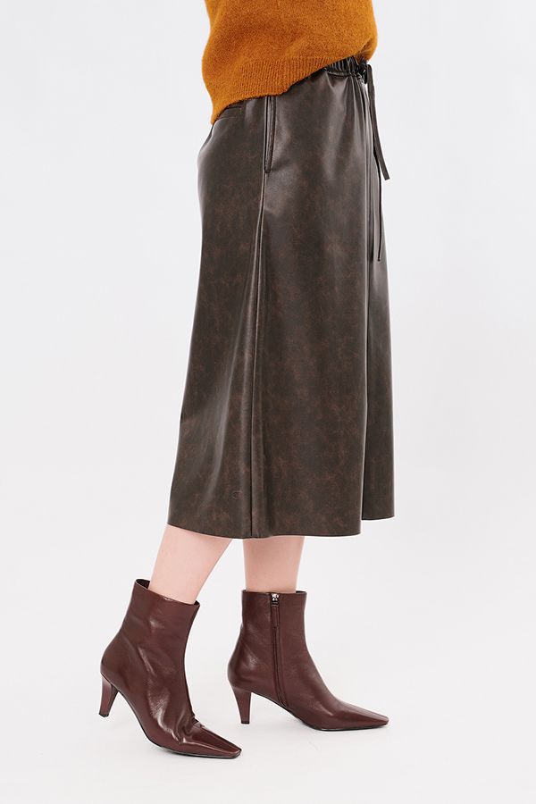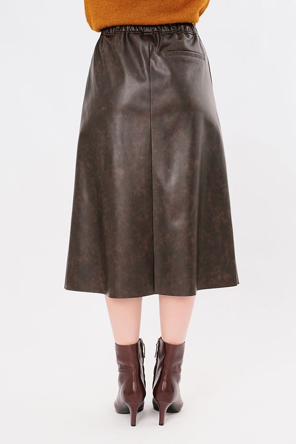 Юбка четырехклинка А-образного силуэта из эко-кожи коричневого цвета с мраморным эффектом. Юбка без застежки, с широким поясом, в поясе резина, кулиска. В боковых швах вертикальные карманыс отстрочкой. Низ изделия открытый срез. По задней правой половинке листочка с имитацией кармана. Длина изделия 78 см. Размер модели на фото: 44. Параметры модели: 90-64-97. Рост модели на фото: 175 см.