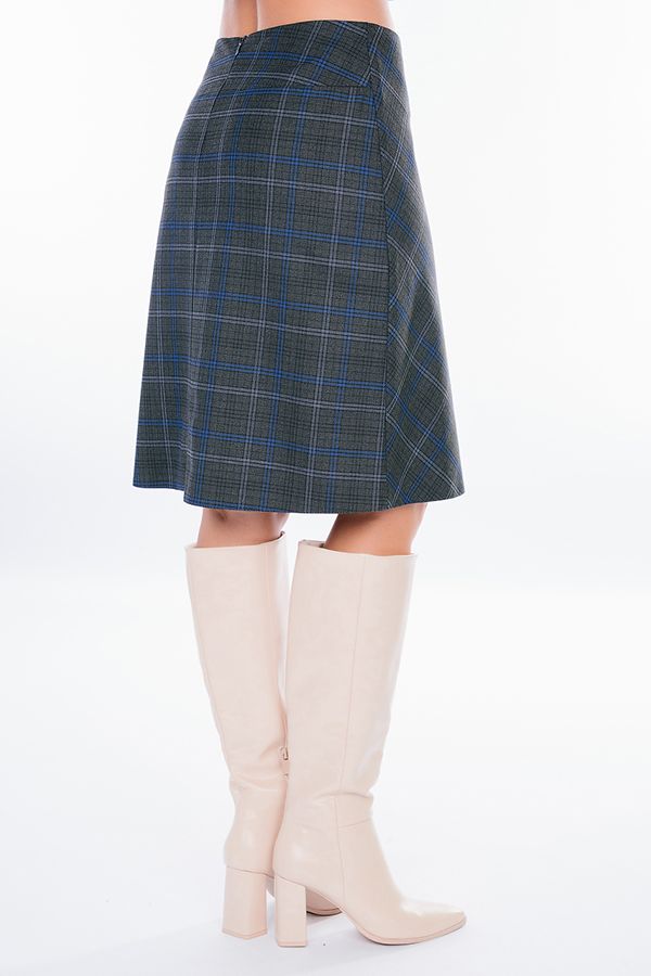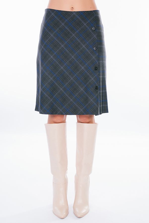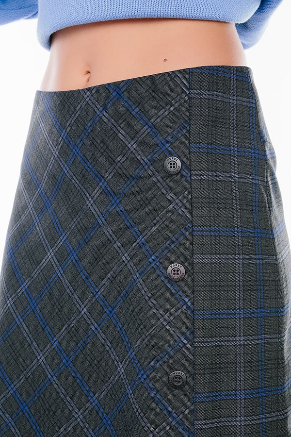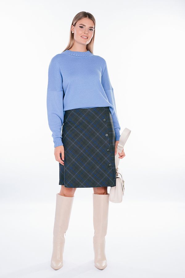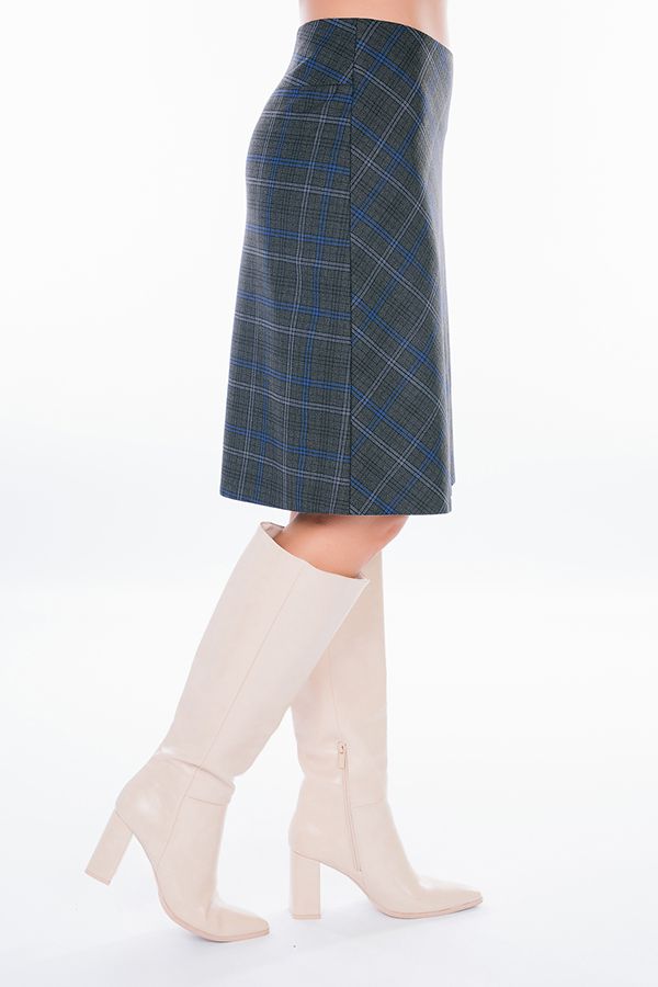 Юбка А-образного силуэта из благородной клетки. По передней половинке разрез, четыре пуговицы. Сзади кокетка, в среднем шве потайная молния. Юбка на подкладе. Длина изделия: 56 см. Размер  модели на фото: 44.  Параметры модели: 86-63-94. Рост модели на фото: 173 см.