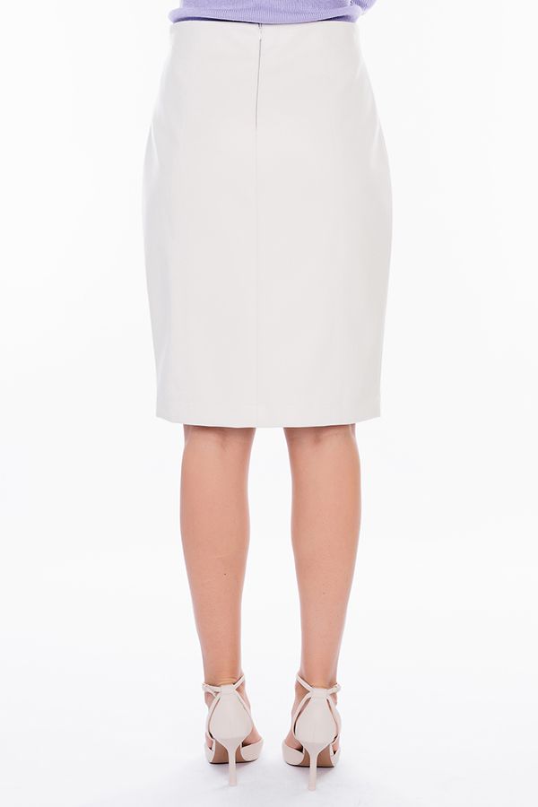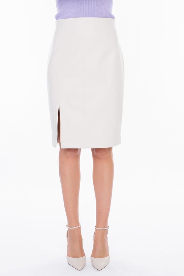 Юбка прямого кроя из эко-кожи белого цвета с рельефными отстрочками по передней и задней полочке. Застёжка потайная на молнии, расположена сзади, в среднем шве. По переду с правой стороны разрез, благодаря которому юбка не будет сковывать ваших движений во время ходьбы. Длина изделия 61 см. Числовые параметры соответствуют размеру 44. Размер модели на фото: 44. Параметры модели: 86-63-94. Рост модели на фото: 173 см.