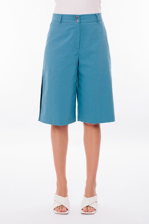 Современные широкие шорты с разрезами в боковых швах. Детали: спереди застежка на молнию и две пуговицы, карманы с отрезным бочком, сзади две вытачки, по спинке изделия в поясе резина на сборке, на поясе шлевки. В боковых швах разрезы по 27 см. . Длина по внутреннему шву - 34,5 см. Ширина низа - 31 см. *Числовые параметры соответствуют размеру 42. Размер модели на фото: 44 Параметры модели: 86-63-94. Рост модели на фото: 173 см.
