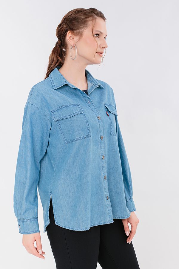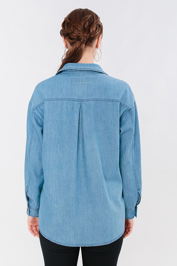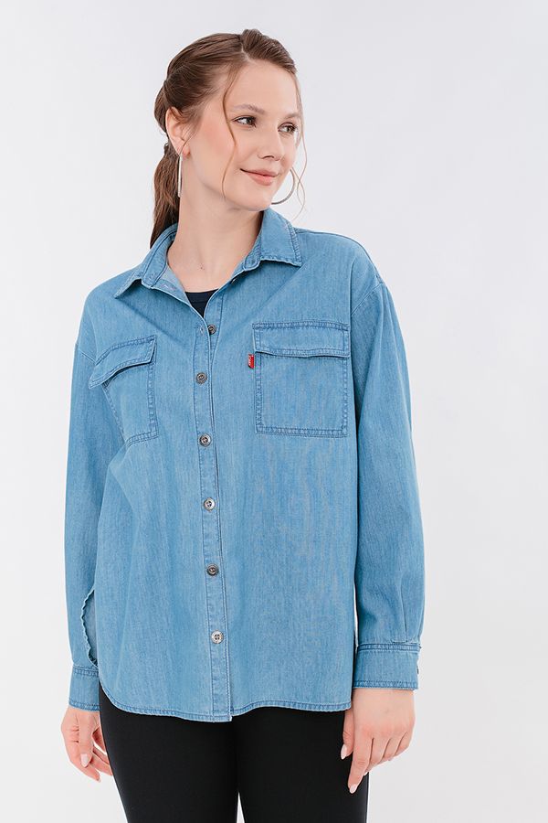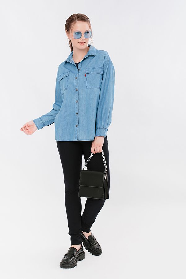 Классическая рубашка свободного силуэта из тонкого денима. Детали: спереди застежка на пуговицы, накладные карманы с клапаном, в боковых швах разрезы, по спинке кокетка. Длина по спинке 73 см. Размер модели на фото: 46. Параметры модели: 94-65-100. Рост модели на фото: 175 см.