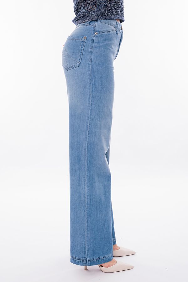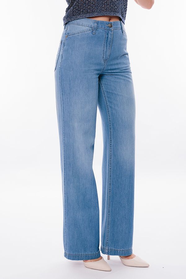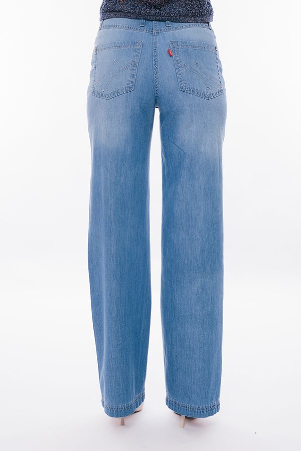 Модные молодежные джинсы из вареного тонкого светло-голубого денима. Детали: спереди застежка на болт и молнию, оригинальные боковые карманы с хольнитенами, сзади под кокеткой накладные карманы с фигурной строчкой, на поясе шлевки. Длина по внутреннему шву - 85 см. Ширина по линии низа - 25 см. *Числовые параметры соответствуют размеру 42. Размер модели на фото: 44. Параметры модели: 86-63-94. Рост модели на фото: 173 см. ВНИМАНИЕ! Брюки маломерят на размер!