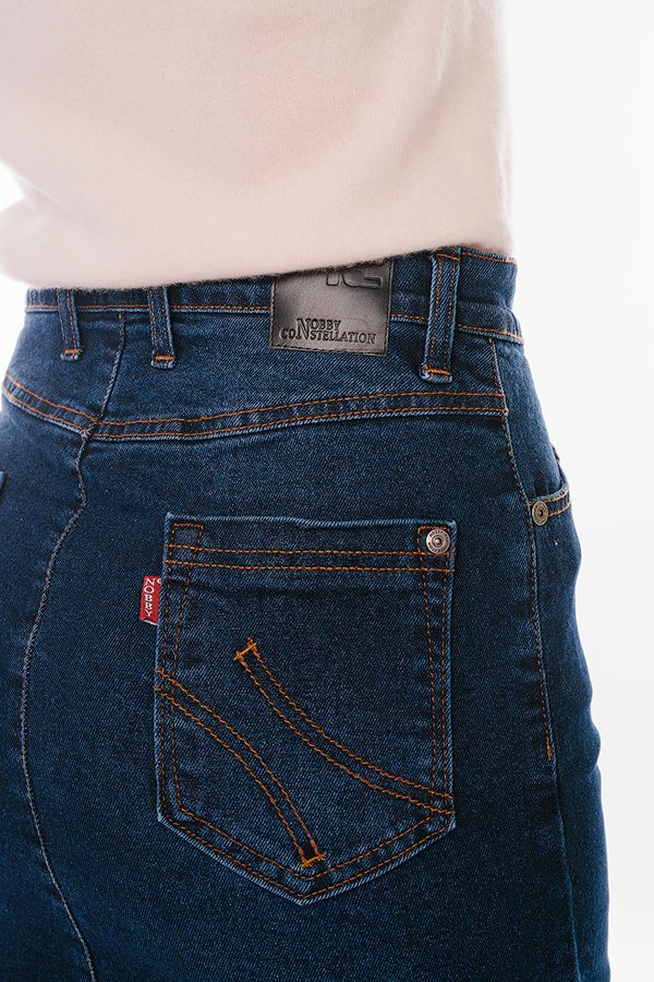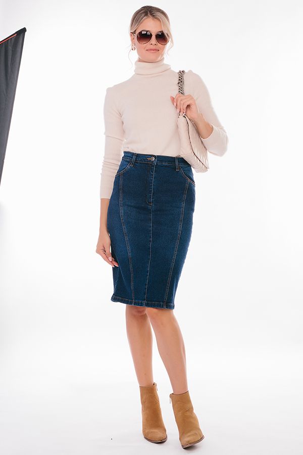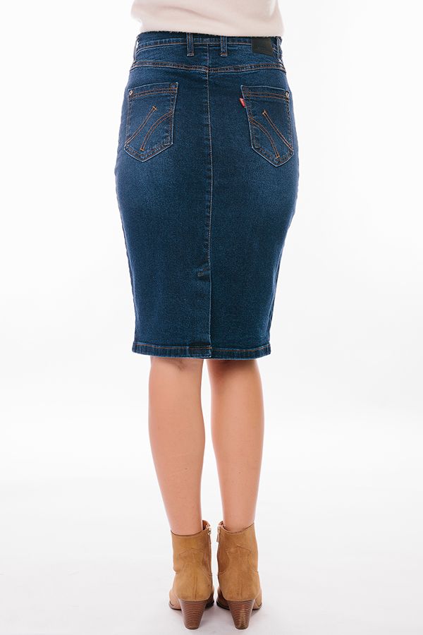 Юбка из денима, чуть приуженная, с рельефными отстрочками по передней половинке. Спереди карманы, сзади под кокеткой накладные карманы, разрез. Застежка на молнию и болт. На поясе шлевки. Длина изделия - 61 см. Размер модели на фото: 44. Параметры модели: 86-63-94. Рост модели на фото: 173 см.