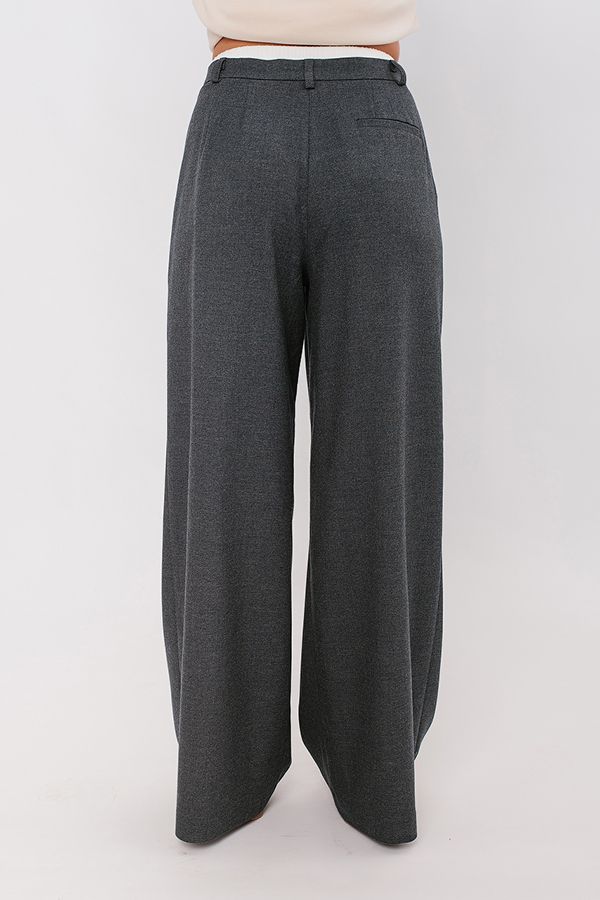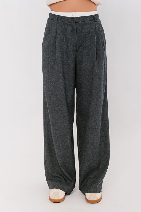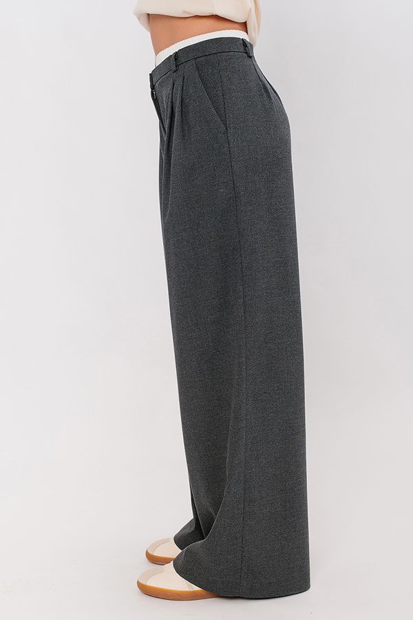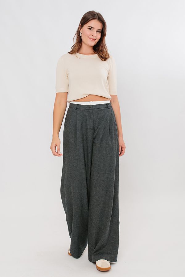 Молодежная модель брюк с "трусами". Мягкая костюмная ткань актуального серого цвета. Детали: Спереди застежка на погувицу и молнию, по бокам карманы, по поясу два защипа. Сзади , по правой половинке имитация кармана в рамке, по две вытачки, на посясе шлевки. К поясу брюк пришит белый бельевой трикотажный пояс-резинка на двух кнопках - имитаци "трусов". Брюки плотно садятся по талии и свободно прилегают по бедрам. Длина по внутреннему шву - 80 см. Ширина по линии низа: 34 см. *Числовые параметры соответствуют размеру 44. Размер модели на фото: 44. Параметры модели: 86-63-94. Рост модели на фото: 173 см.
