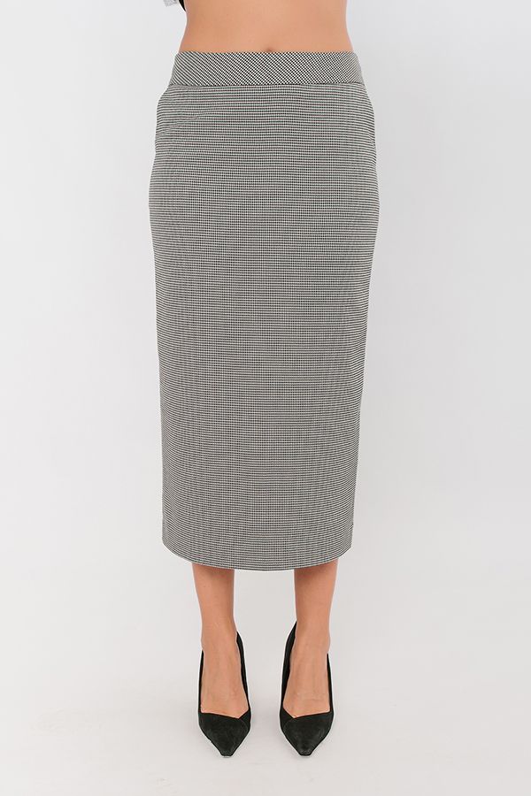 Элегантная модель прямой юбки-миди. Юбка на подкладке, попередный половинке фигурный пояс-кокетка, боковые карманы. По задней половинке вытачки, застежка на потайную молнию в среднем шве, щлица. Длина изделия 83 см. Размер модели на фото: 44. Параметры модели: 86-63-94. Рост модели на фото: 173 см.